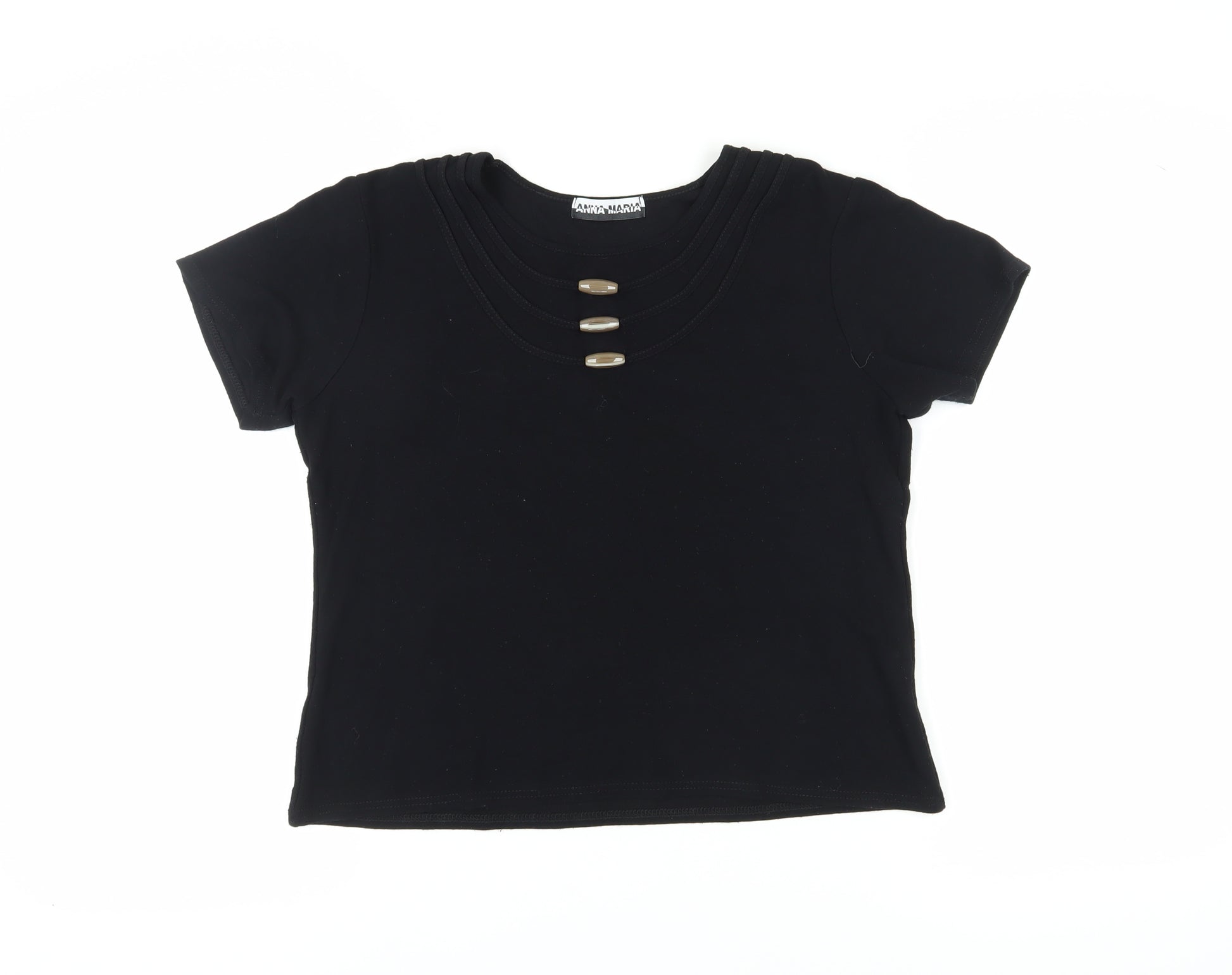 Upgrade your casual wardrobe with this sleek Anna Maria Women's Black T-Shirt, designed to offer a perfect blend of style and comfort. This basic yet trendy piece is crafted in a solid black colour, ensuring versatile styling options. Ideal for those who love a minimalist look, the button accents on the front add a touch of sophistication, making it a charming addition to any outfit. Designed with a regular fit and a classic short sleeve type, this t-shirt is suitable for all seasons and a variety of occasions, from casual outings to laid-back gatherings. Made from an 85% Viscose, 10% Nylon, and 5% Elastane blend, it provides a comfortable stretch, while maintaining its shape and fit. Its round neckline complements its simple yet stylish design, making it an essential piece in any wardrobe. Though lightly worn, it is in excellent condition without original tags, priced affordably for immediate wear and enjoyment. Elevate your everyday look with this versatile tee that’s just as perfect for layering under a jacket as it is for standalone style. Don’t miss out on this wardrobe staple, providing comfort and chic aesthetics for any fashion-forward woman.