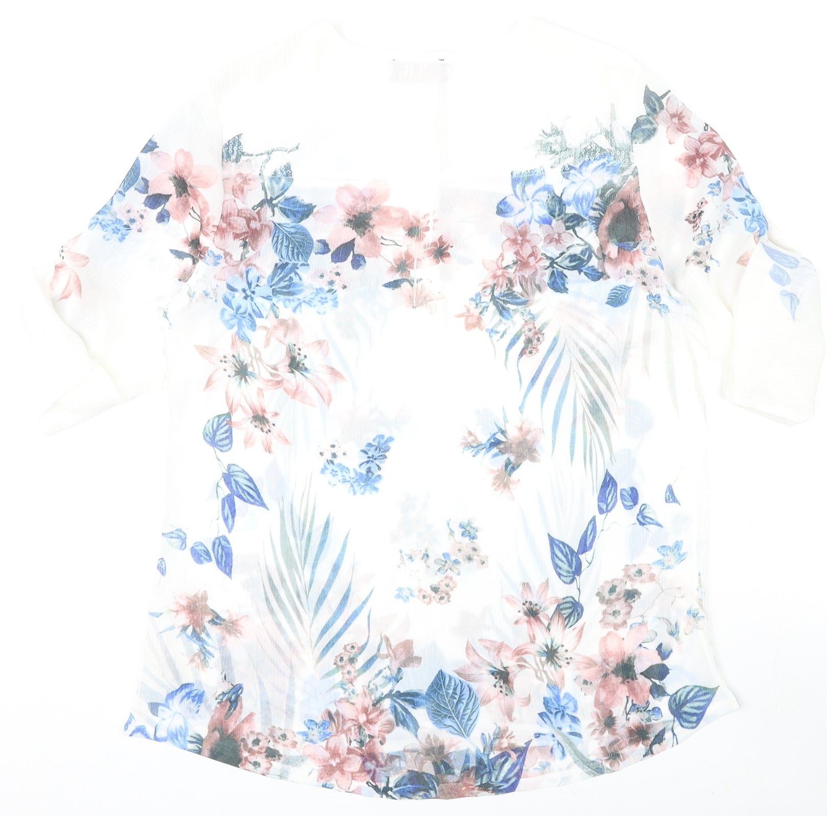 Womens White Floral Polyester Basic Blouse Size 10 Round Neck