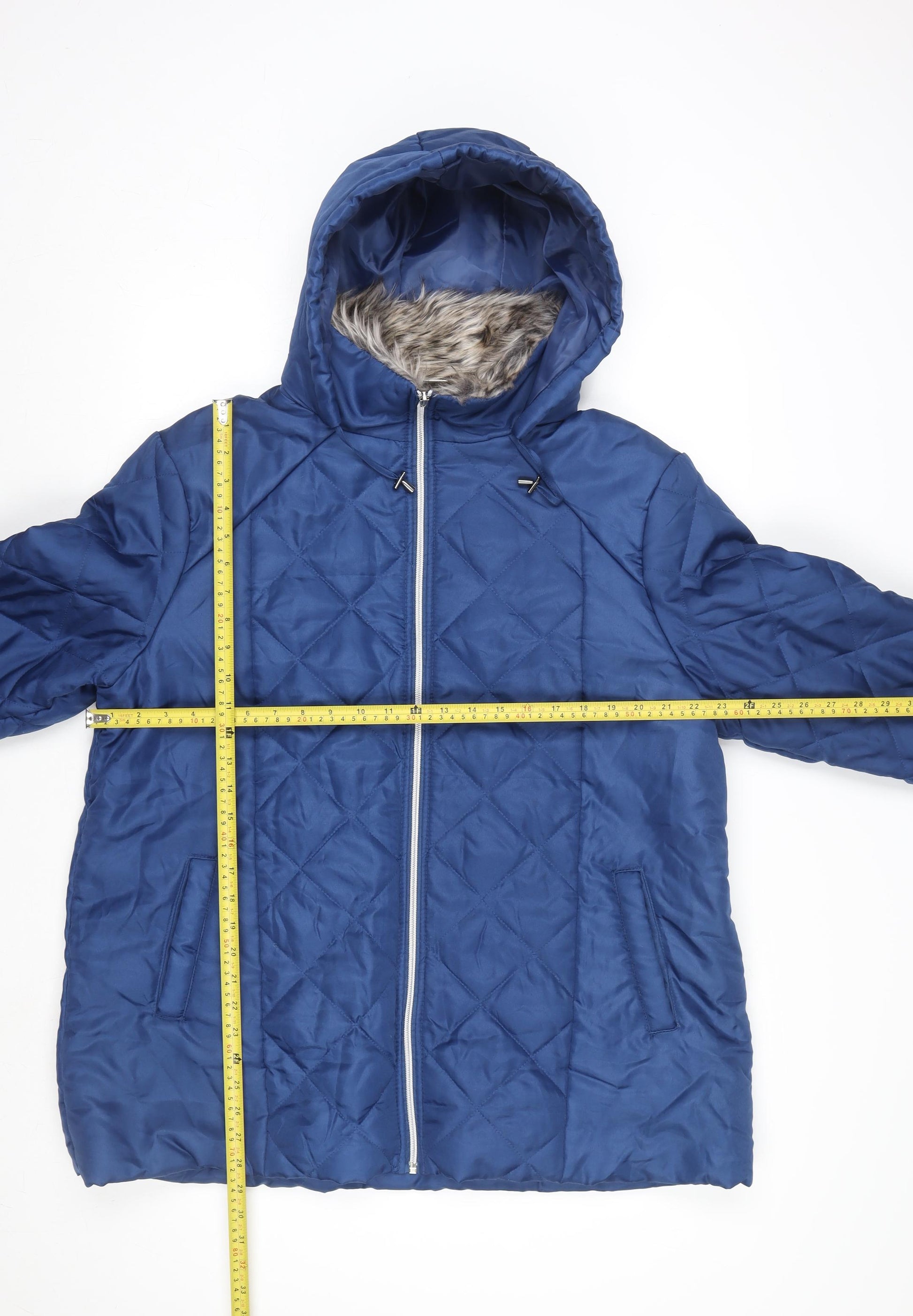 Stay cosy and effortlessly stylish during the colder months with this Anne de Lançay women's blue quilted puffer jacket. Crafted from durable polyester, the outer shell of this mid-length coat offers excellent warmth and comfort, while the soft faux fur trim hood adds a luxurious touch. The jacket features a full zip-up front, making it practical and easy to wear, along with two side pockets that are perfect for keeping your hands warm or storing essentials while on the go. Its quilted, diamond-stitch design not only enhances the jacket’s aesthetic appeal but also helps trap heat effectively, keeping you insulated throughout winter. Ideal for casual, everyday wear, this jacket is both fashionable and functional, suiting a variety of occasions — from winter walks to city errands. The polyester lining ensures additional comfort and smooth layering over knitwear or tops. Designed with a regular fit, this jacket allows for comfortable movement without feeling bulky. Its classic blue colour is versatile enough to complement any outfit, ensuring it becomes a go-to piece in your wardrobe season after season. While pre-owned, it remains in excellent condition with only minimal signs of gentle use, offering great value without compromising on style or quality. Perfect for cold weather, this Anne de Lançay jacket provides an ideal balance of practicality, style, and comfort, making it a superb everyday outerwear choice for the modern woman seeking warmth and elegance during the winter months.