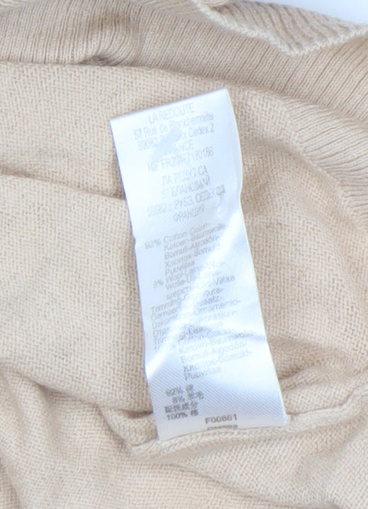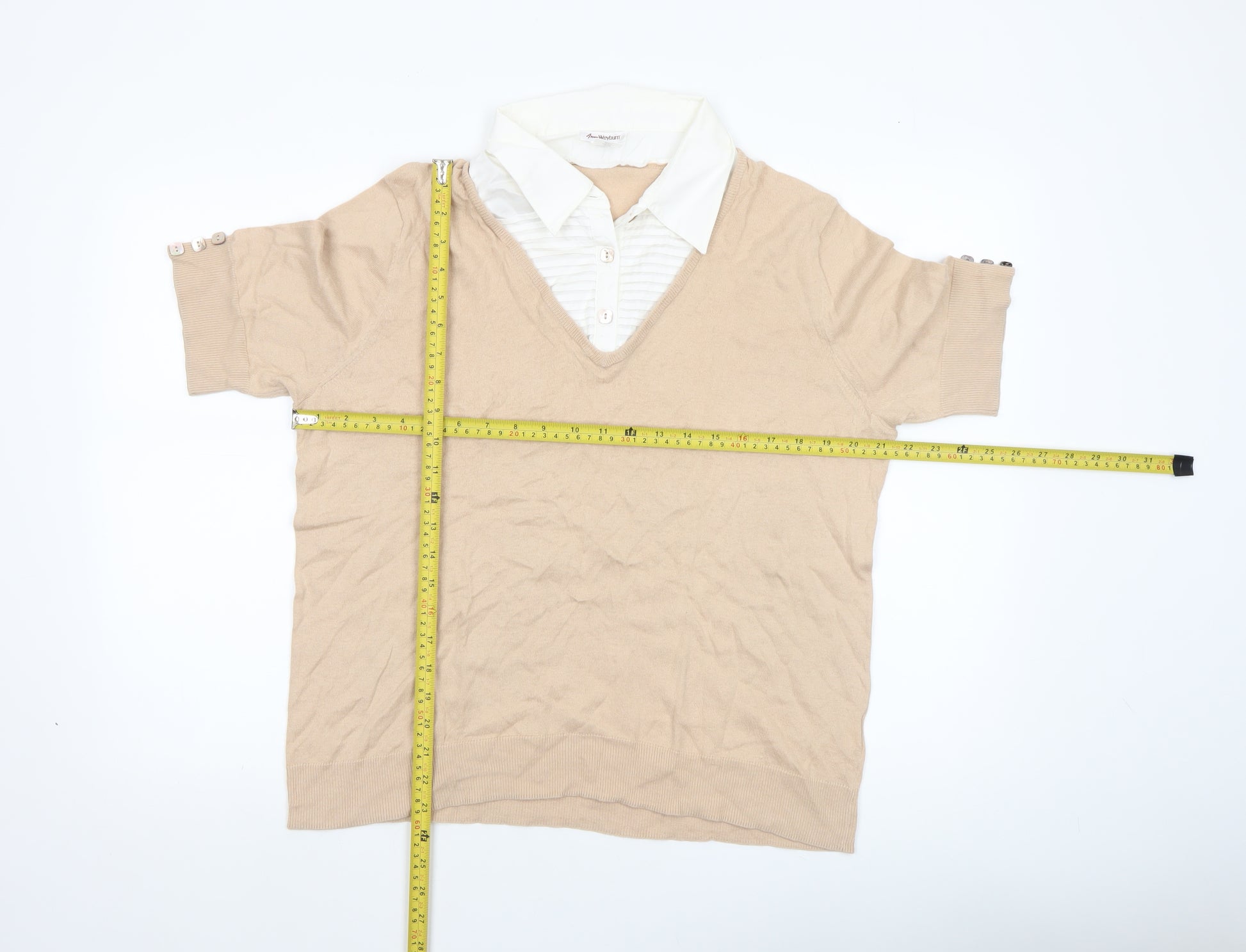 Elevate your casual and workwear wardrobe with this elegant Anne Weyburn blouse from La Redoute, designed to blend comfort and timeless style. Crafted in a refined beige knit, this versatile top offers a sophisticated layered look with its white collared neckline and V-neck overlay effect. Beautifully made from a soft and breathable cotton-rich fabric with a touch of cashmere and polyamide, it provides an exceptionally gentle feel against the skin while maintaining its structure and shape. The short sleeves with decorative buttons on the cuffs introduce a subtle accent, perfect for adding a touch of refinement to your everyday ensemble. The regular fit ensures a flattering drape suitable for various body shapes, making this top both practical and effortlessly chic. Ideal for transitional seasons like spring and autumn, this lightweight piece can be easily paired with tailored trousers or a sleek pencil skirt for the office, or with jeans for a more relaxed weekend outfit. The pullover style enhances ease of wear while keeping a clean and polished silhouette. Finished in a solid beige tone, this blouse exudes understated sophistication and can seamlessly complement both bold prints and classic neutrals. In excellent used condition with only minor creasing visible, it represents great value and enduring quality. Whether for business meetings, lunches, or casual days out, this Anne Weyburn blouse is a wardrobe essential for women who appreciate refined details and enduring comfort. Machine washable for easy care and practicality, this versatile piece offers the perfect balance of elegance and everyday wearability.