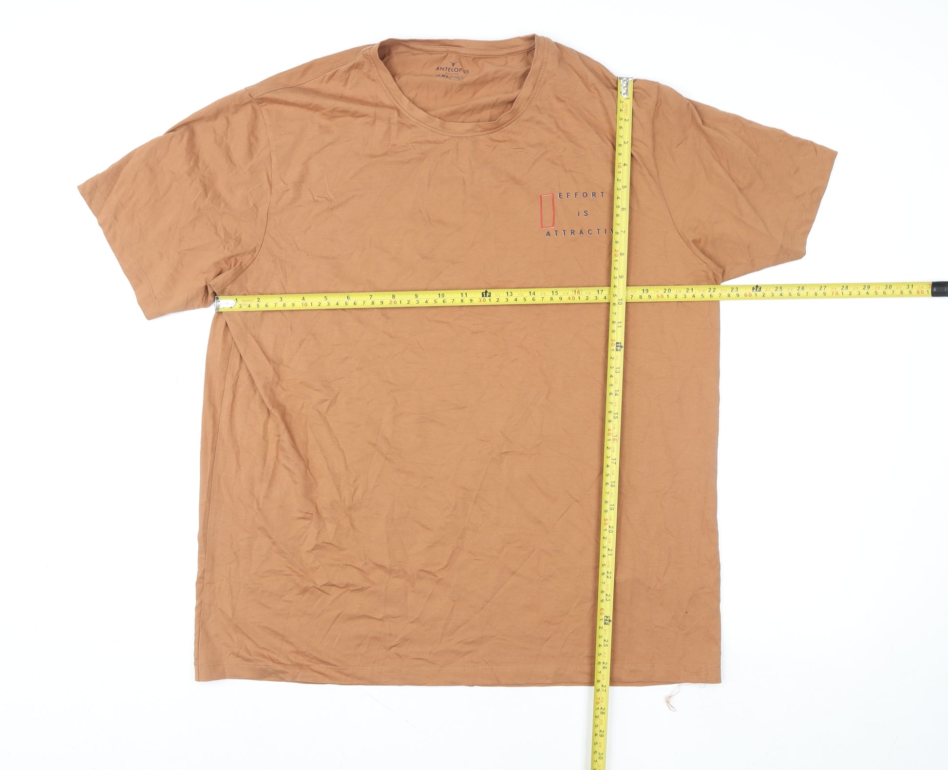 This Antelopus Outfitters Men’s Brown 2XL Cotton Crew Neck T-Shirt delivers effortless style and functionality for everyday wear. Crafted from a soft, breathable jersey fabric blend of 95% cotton and 5% lycra, it offers comfort with just the right amount of stretch. The classic crew neckline and short sleeves make it ideal for layering or wearing on its own in warmer weather. Designed in a warm brown shade, this T-shirt effortlessly complements casual wardrobes and pairs easily with denim, chinos, or shorts. The minimalist chest print featuring the quote 'Effort Is Attractive' adds a subtle graphic touch, ideal for modern, laid-back styling. Its regular fit ensures ease of movement and all-day comfort. The shirt’s lightweight, breathable qualities make it suitable for summer wear or active casual days, while the cotton-rich composition offers durability and easy care being machine washable. Made in India, this Antelopus Outfitters T-shirt shows a clean, versatile design that fits both men and unisex adult wearers comfortably. In excellent condition, this T-shirt shows only light wrinkling consistent with storage, with no visible flaws, stains or damage noted. A great casual piece that bridges comfort, character, and simplicity, making it perfect for weekend wear or relaxed outings. This garment’s timeless solid brown tone, paired with the uplifting inspirational motif, delivers dependable wardrobe appeal for style-conscious individuals seeking everyday comfort with understated flair. Ideal for mixing with jeans, joggers, or shorts, it’s a reliable staple enhanced by a durable yet soft cotton jersey material ideal for repeated wear throughout multiple seasons. Experience premium comfort and casual sophistication with this easy-going, motivational T-shirt from Antelopus Outfitters.