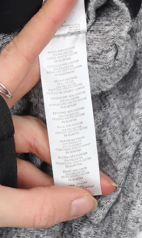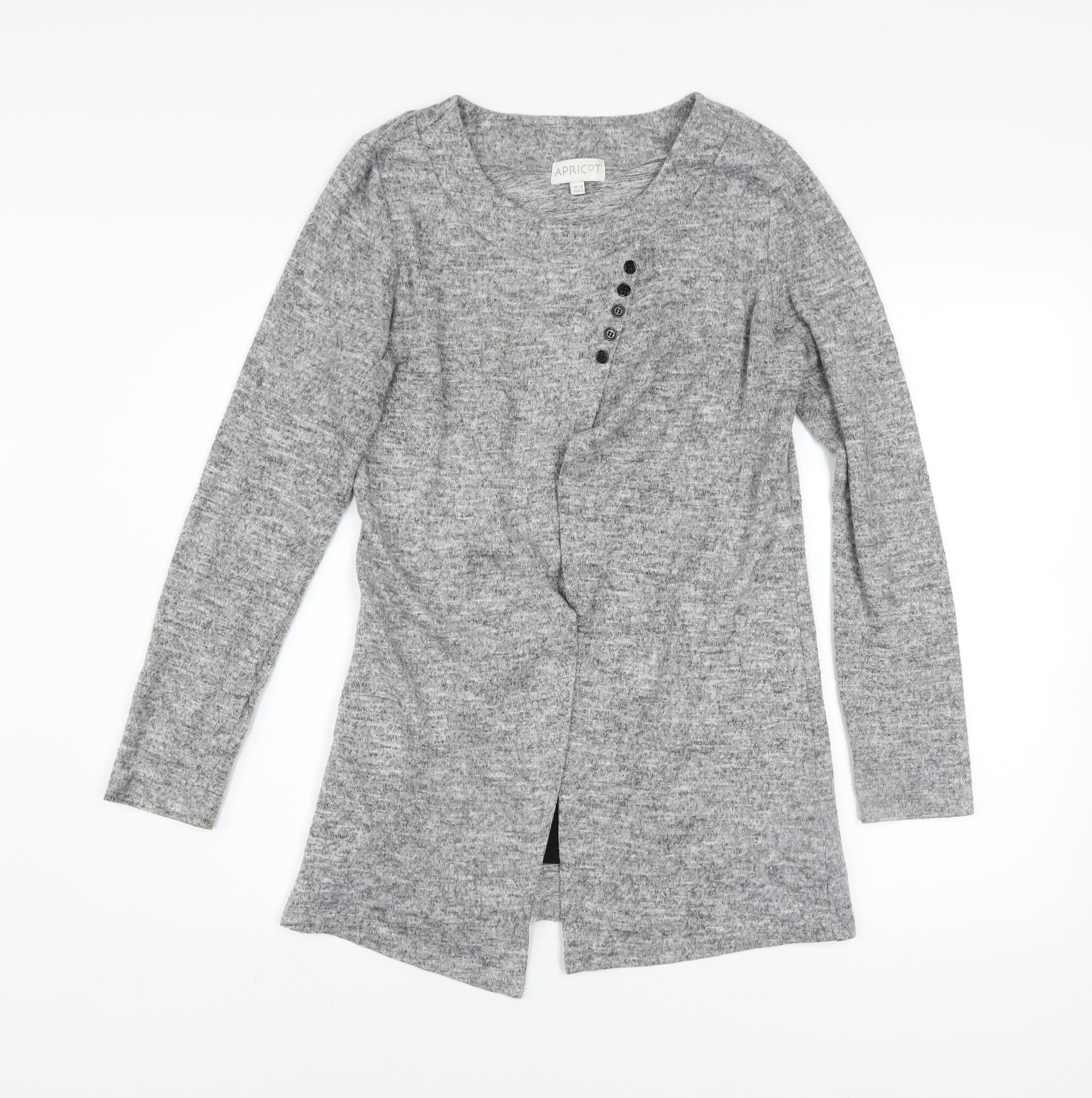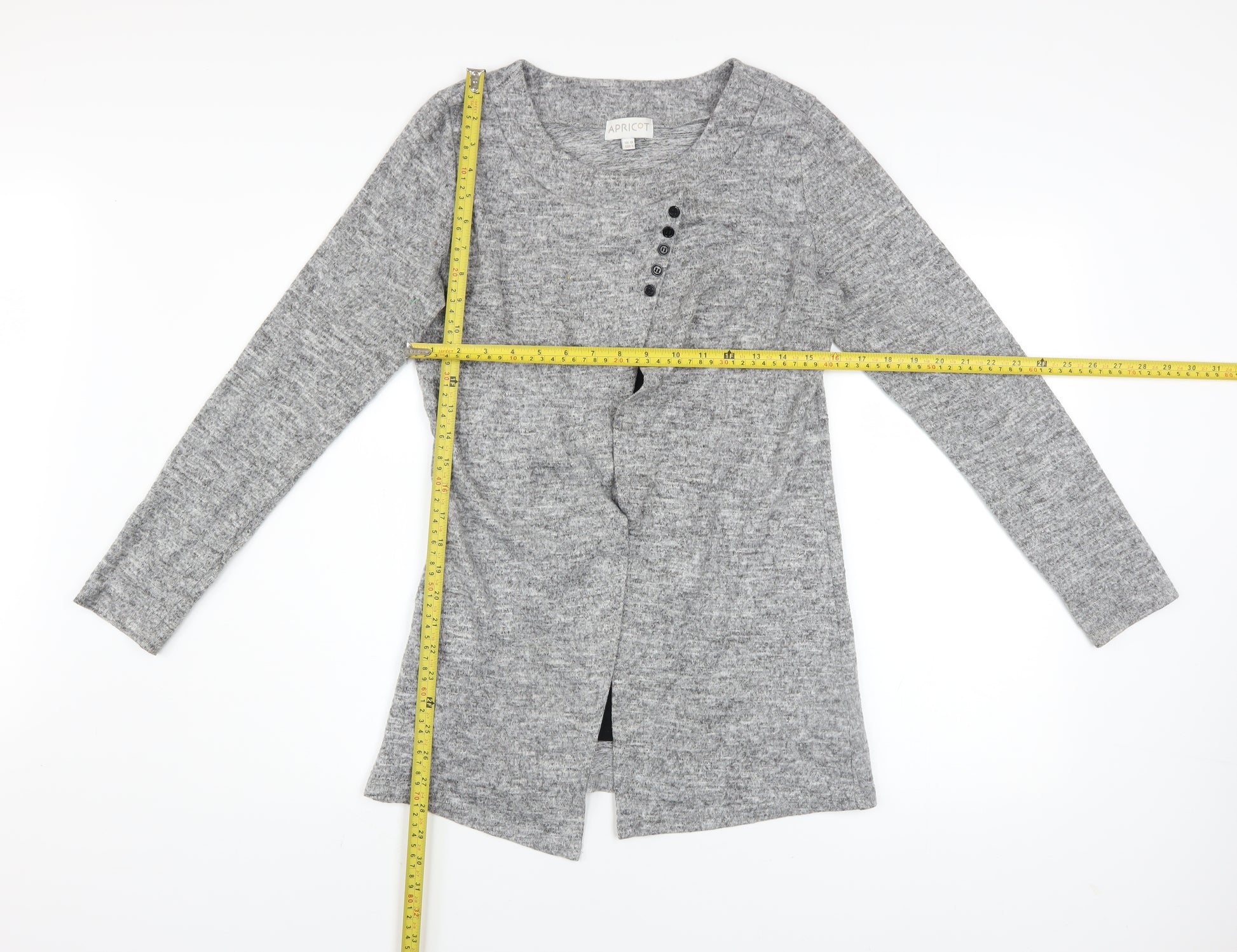 Stay effortlessly stylish with this cosy grey cardigan from Apricot, perfect for layering through the seasons. Crafted with a soft blend of viscose, polyester, and elastane, it offers both comfort and flexibility while maintaining its flattering shape. The cardigan features a gentle round neckline and subtle button accents that add a hint of classic charm to the modern design. Its long sleeves and lightweight knit construction make it ideal for transitioning between autumn, winter, and spring, pairing easily with both casual and workwear outfits. The regular fit and slightly elongated cut provide a sleek silhouette, ideal for wearing over blouses, tops, or dresses. Designed in a versatile grey hue, this cardigan complements any wardrobe, offering a timeless look that’s both practical and chic. With its machine washable fabric, it’s easy to care for and ready for everyday wear. This piece is in very good pre-owned condition with only a small mark near the button area, showing minimal signs of previous use. Perfect for those who appreciate effortless style and comfort, this Apricot cardigan adds warmth and refinement to your everyday ensemble. Whether dressed up for the office or layered casually for a relaxed outing, it brings understated sophistication to every occasion.