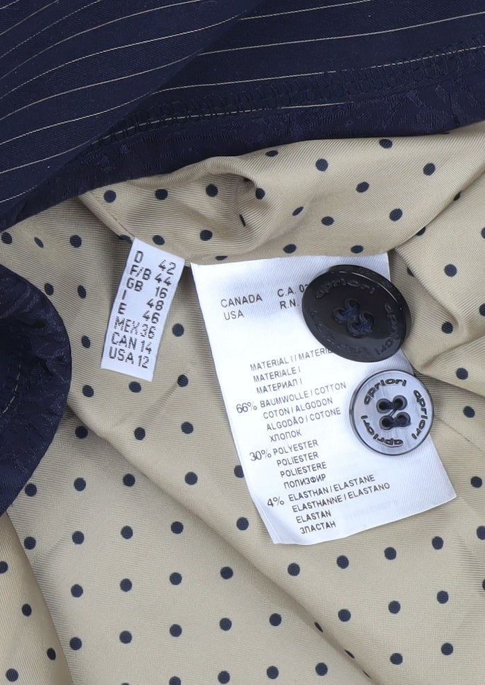 Upgrade your professional wardrobe with this stylish Apriori women’s pinstripe blazer. Designed in a timeless navy blue shade with subtle pinstripes, it embodies elegance while offering versatility for a range of occasions. Crafted from a high-quality blend of 66% cotton, 30% polyester, and 4% elastane, this blazer delivers both comfort and structure, making it perfect for long days at the office or formal gatherings. The regular fit cut provides a flattering silhouette while ensuring ease of movement throughout the day. The design includes a classic notch lapel, three-button front fastening, and practical front buttoned pockets, which blend functionality with style. Long sleeves with single-button cuffs and a tailored finish give it a refined touch. Inside, it features a smooth polyester lining for added comfort and an excellent fit. This single-breasted style is ideal for business, workwear, or formal events, effortlessly pairing with trousers or a skirt for a polished look. With its regular jacket length, this Apriori blazer works equally well layered over blouses for meetings or dressed down with jeans for a smart-casual aesthetic. The garment is in excellent condition with only light signs of wear and retains a crisp and professional appeal. Machine washable for convenience, this jacket also makes practical everyday wear. A classic wardrobe essential, it brings the perfect blend of sophistication and function, ensuring it will remain a dependable favourite for years to come. Perfect for women seeking a stylish and well-made blazer in a UK size 16, this piece will help you stand out with confidence in both professional and semi-formal settings. Add this versatile Apriori blazer to your collection and enjoy timeless style and comfort in one chic design.