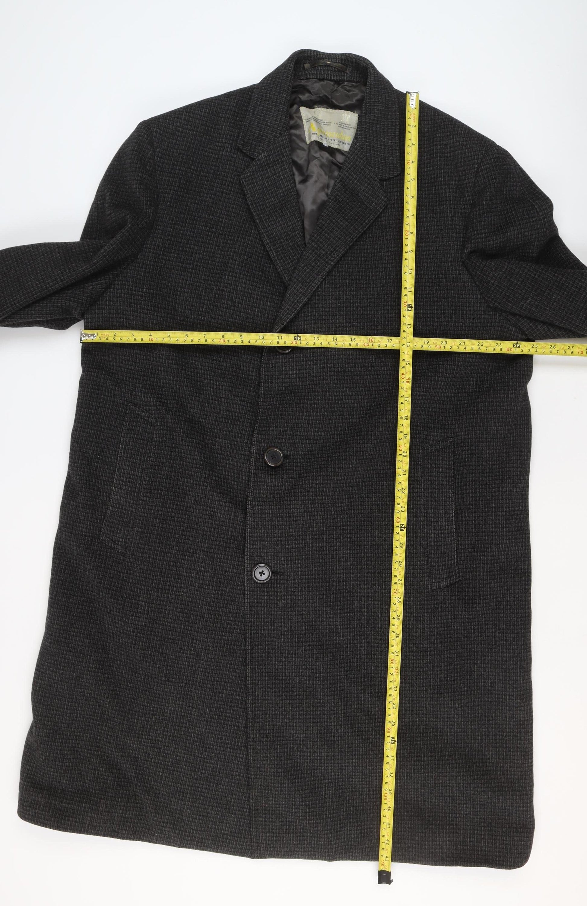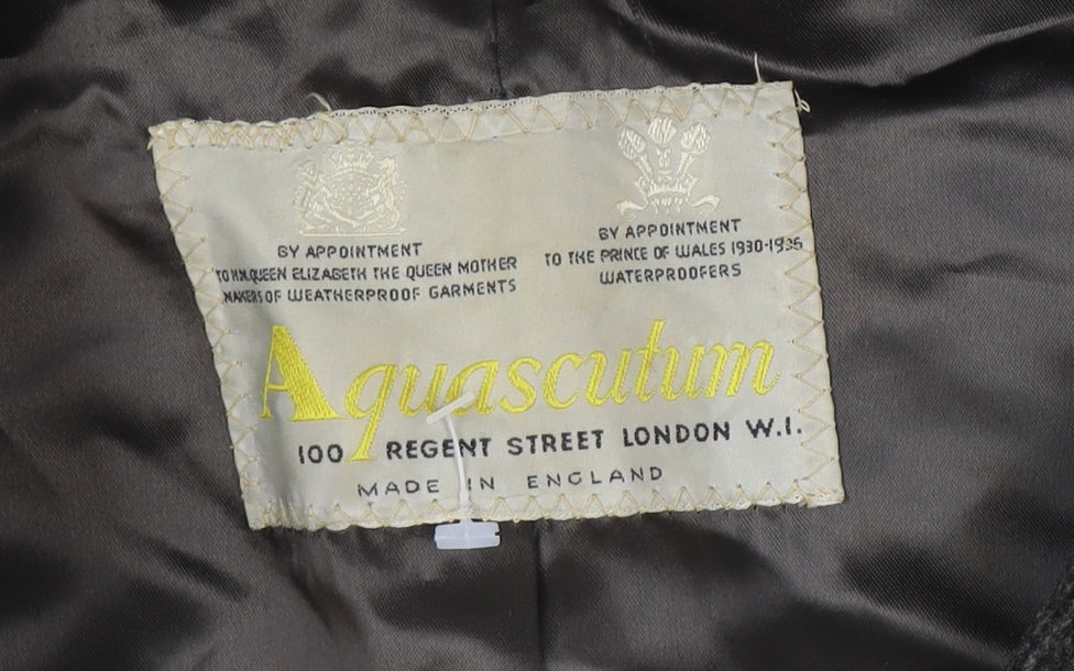 Step out in timeless sophistication with this Aquascutum men's grey long overcoat, expertly tailored in England. Crafted from 100% premium wool in a subtle check pattern, this classic piece embodies the refinement and quality for which Aquascutum is renowned. The coat's structure gives it an elegant silhouette, making it perfect for both business and more formal occasions. Designed in a regular fit with a traditional notch collar, this piece offers comfort and warmth without compromising on style. It features a fully lined interior in smooth viscose for ease of wear and extra durability, as well as a single-breasted front with button fastening that enhances its streamlined appearance. Functional details such as two exterior front pockets and an interior chest pocket combine practicality with understated British design. Ideal for the cooler months of autumn and winter, the heavy wool construction ensures you remain warm and comfortable, while the neutral grey shade pairs effortlessly with formal suiting or smart casual attire. This vintage Aquascutum overcoat, with its heritage appeal, is perfect for the modern man seeking a coat that balances traditional tailoring with versatility. Despite light general wear consistent with age, the coat remains in excellent condition with no visible marks or damage. A must-have addition to any discerning wardrobe, this high-quality overcoat captures the sophistication of British menswear at its finest. Perfect for wearing over a suit for professional outings or paired with denim and boots for a more relaxed yet well-dressed look, this Aquascutum wool overcoat promises both style and substance for many years to come.