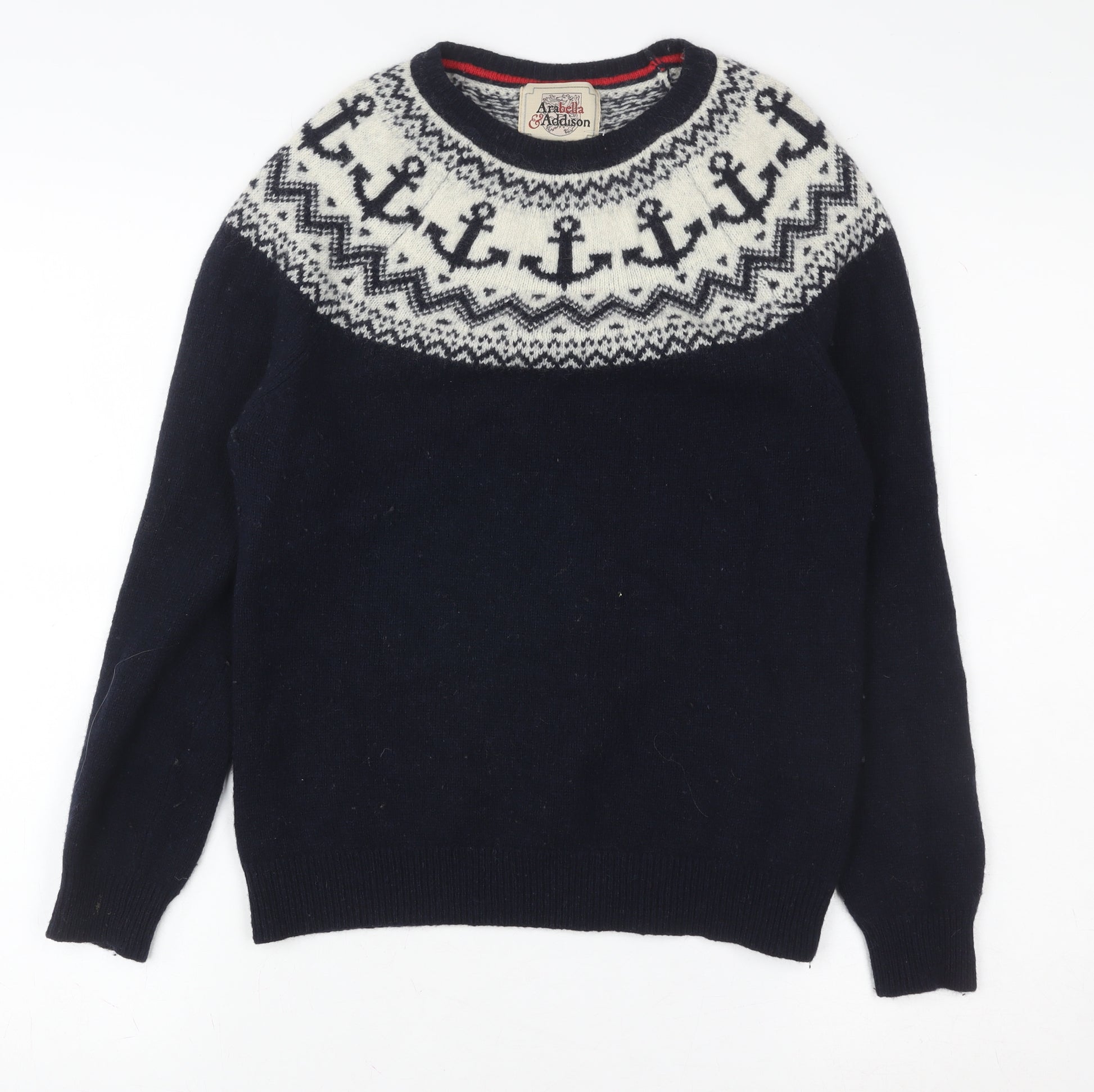 This lovely women's jumper from Arabella & Addison brings classic nautical charm to your wardrobe. Knitted from a soft, warm blend of 80% lambswool and 20% nylon, it provides a cosy yet breathable feel—perfect for layering during the colder months. The rich navy blue shade is enhanced by an eye-catching Fair Isle pattern around the yoke, adorned with anchor motifs that lend a timeless maritime touch to your look. This pullover features a crew neckline and long sleeves, ensuring both comfort and classic styling. The high-quality wool blend offers natural warmth while maintaining a lightweight, flexible feel. Ideal for casual days, autumn strolls, or weekend getaways, this piece pairs beautifully with jeans, chinos, or a wool skirt for a stylish, relaxed ensemble. Designed in a regular fit, it flatters the silhouette without being restrictive. The jumper is in very good pre-owned condition, showing only minimal bobbling from light wear, with plenty of life and softness remaining. Perfect for anyone seeking a quality, well-crafted knit with a nautical twist. Hand wash only to preserve the integrity of the fine fibres. Whether worn as part of a layered outfit or on its own, this Arabella & Addison jumper delivers warmth, style, and timeless British design—ideal for those who appreciate comfort with a touch of coastal elegance.