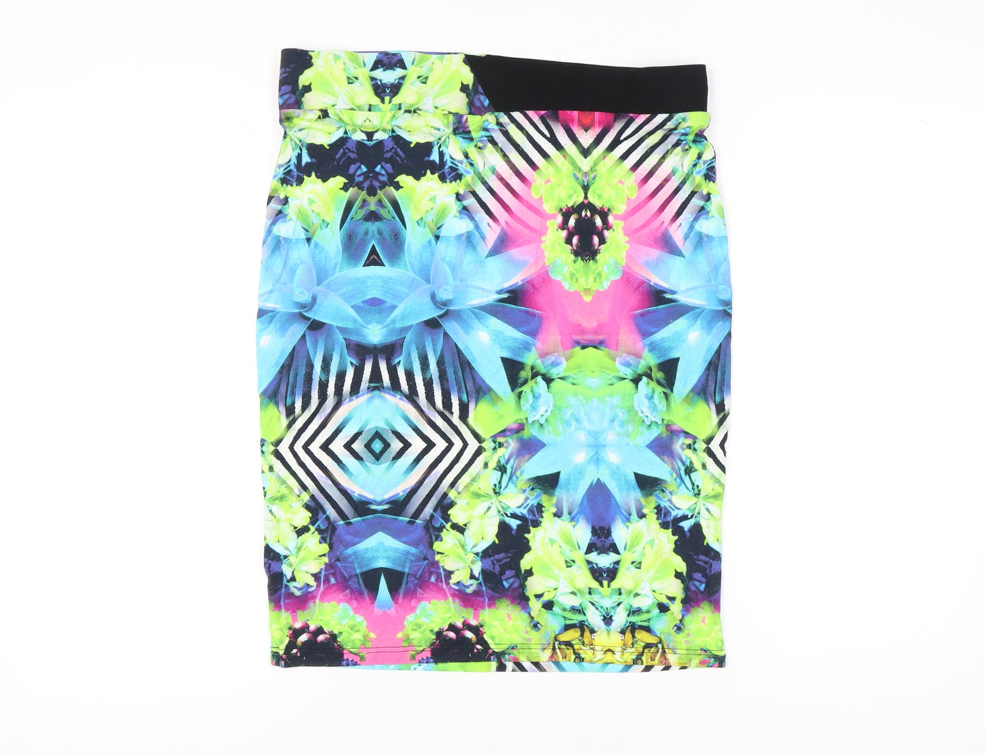 Brighten up your wardrobe with this striking Ariana women’s pencil skirt, designed in a bold multicoloured floral and geometric print that is perfect for making a statement. Cut in a sleek straight & pencil silhouette, this knee length skirt offers a figure-flattering fit that is versatile for both casual and party wear. Made from a comfortable blend of viscose with elastane, the fabric benefits from a touch of stretch, ensuring it moves with you while providing a sleek and smooth fit.The vivid colour palette features eye-catching shades of neon pink, green, blue and black, enhanced with abstract detailing and contrasting stripes, making it an ideal piece for those who love expressive fashion. Its pull-on elasticated waist allows for effortless wear, while the soft jersey construction ensures all-day comfort. Whether you’re styling it with a simple solid top for daytime wear, or a chic blouse and heels for evening outings, this skirt adapts seamlessly to multiple occasions.Perfect for the warmer months, the breathable fabric and vibrant design pair well with spring and summer wardrobes, but with the right layers, this skirt also transitions beautifully into autumn. The versatile pattern and stretch material also make it a go-to choice for holidays, festivals, and weekend outings when you want style without compromising comfort.This Ariana skirt is in excellent pre-owned condition, showing only light signs of wear with no major flaws, ensuring it still has plenty of life left for its next owner. With its modern print and flattering pencil cut, this skirt is an affordable way to inject your outfit choices with energy and personality. Pair with trainers and a denim jacket for a laid-back look or switch to heels and accessories for an instant evening-ready transformation.A truly standout piece that captures both comfort and style, this Ariana skirt will quickly become a favourite in your wardrobe rotation.