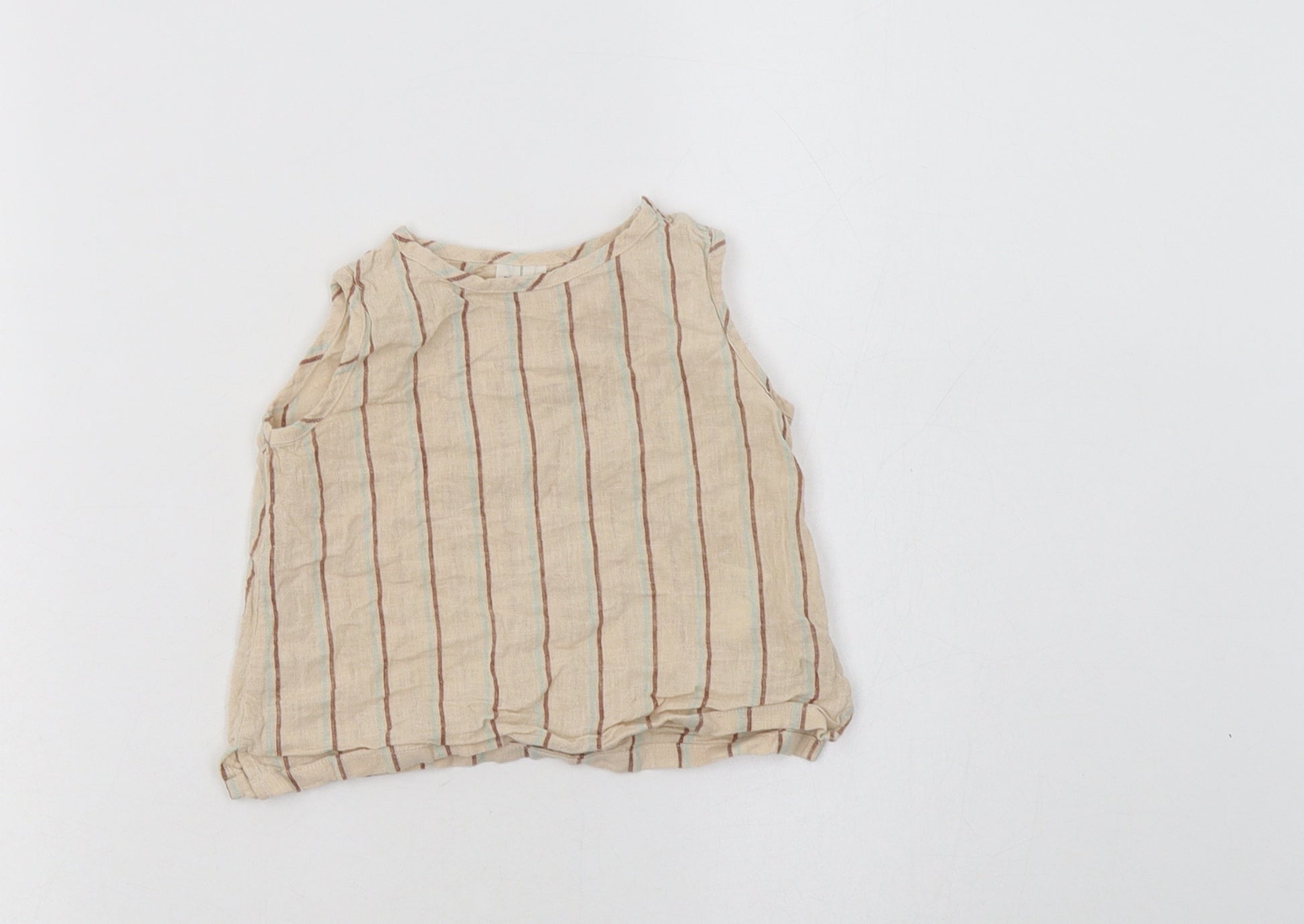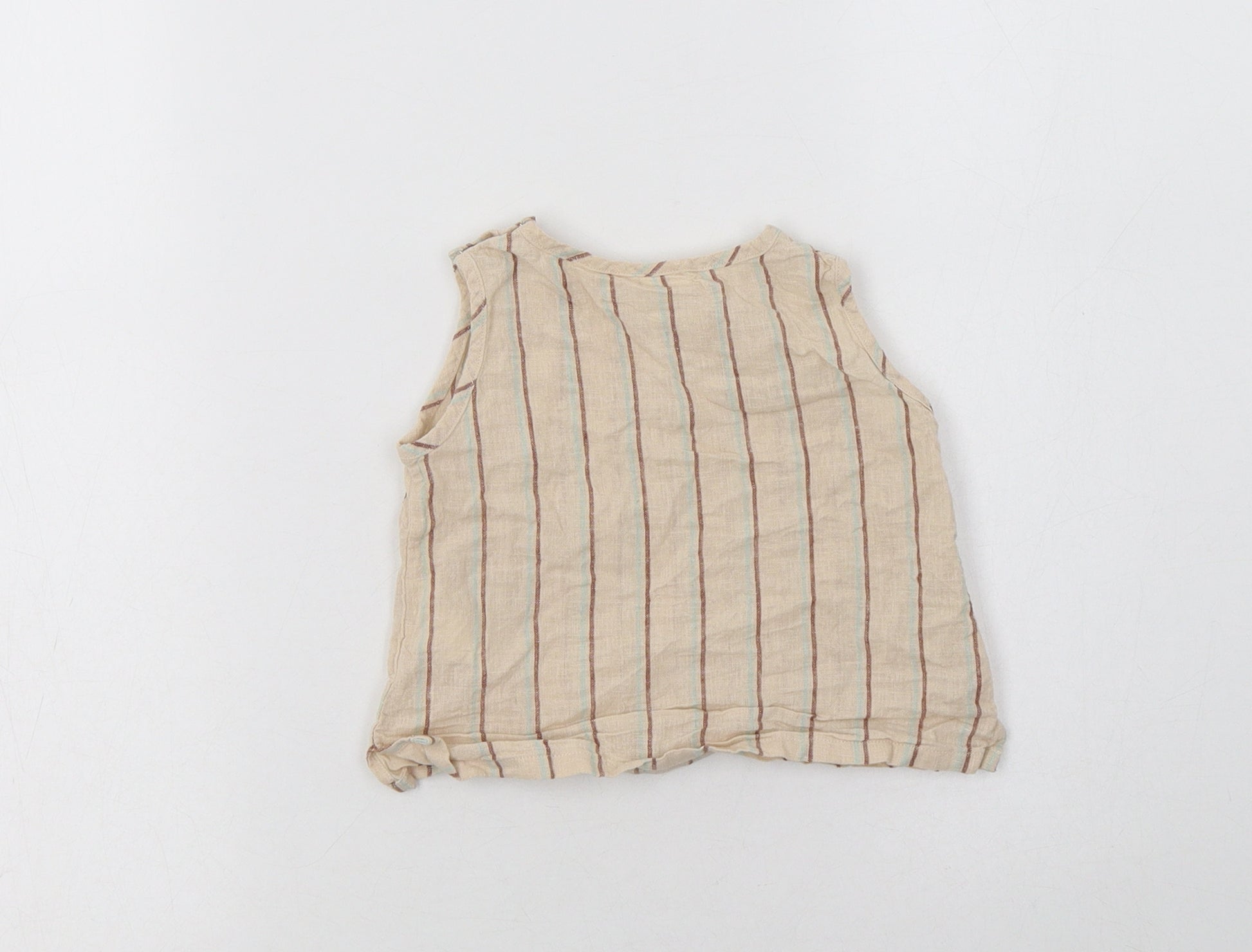Baby Beige Striped Linen Basic Blouse Size 6-9 Months Crew Neck Snap