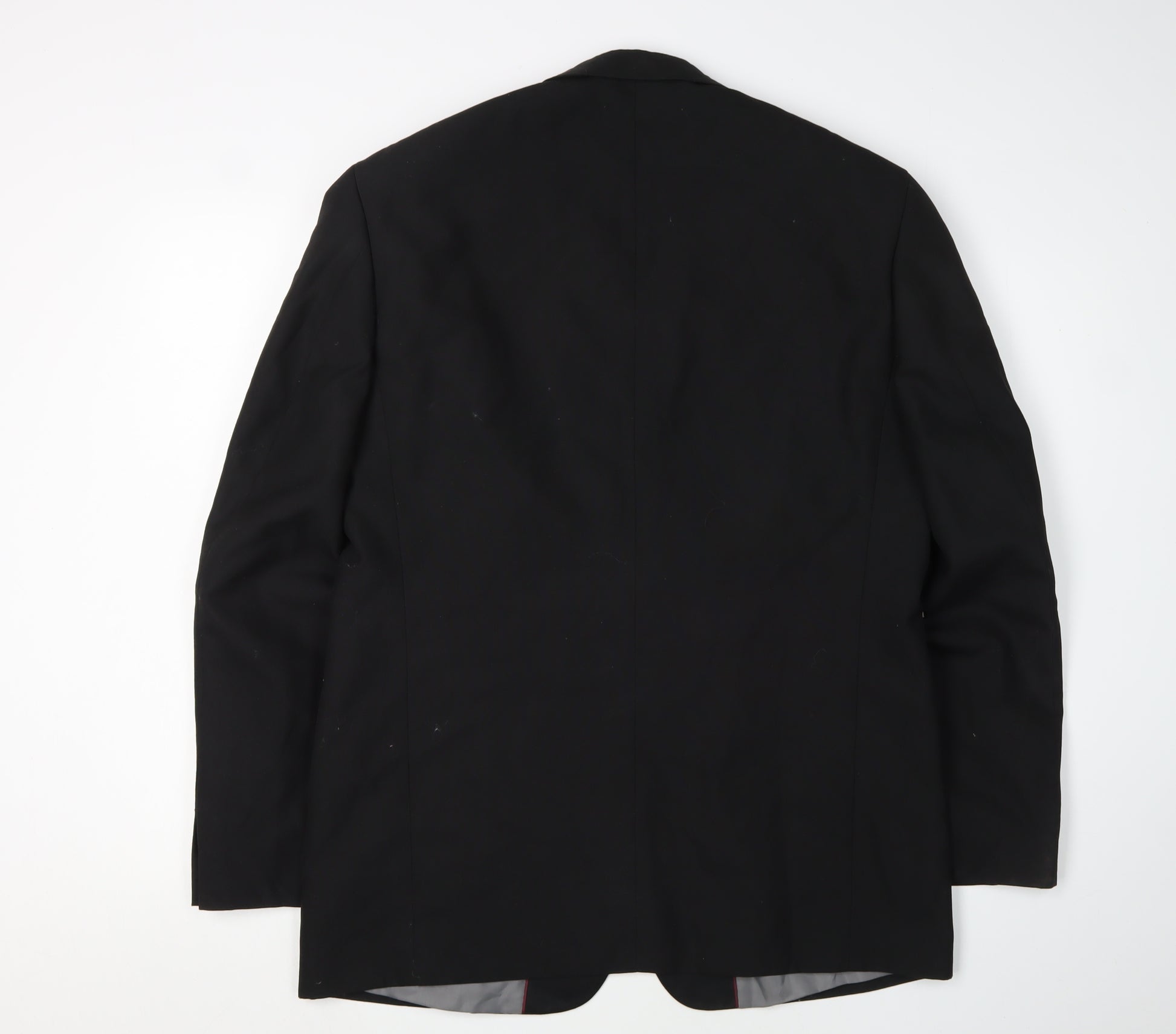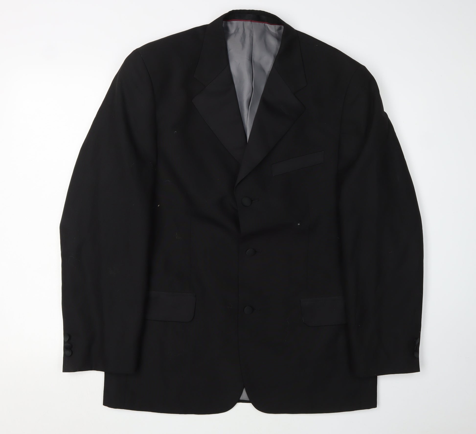Step into elegance with this Armando Men's Black Suit Jacket. Designed for the modern man, it features a classic notch lapel and a single-breasted cut that ensures a tailored fit. Made with a sophisticated blend of 55% polyester and 45% wool, this jacket offers both comfort and durability, making it a perfect choice for formal occasions or a smart addition to your wardrobe for office settings. The jacket is constructed with meticulous attention to detail, featuring a regular length and a smooth polyester lining for added comfort. Ideal for autumn and winter seasons, its sleek black colour complements a variety of outfits, ensuring you look stylish and confident. Despite being in excellent condition with only slight wear on the fabric, the jacket retains a pristine look that will impress on any occasion. The classic three-button front adds an element of timeless style, while the single-vented back enhances mobility, making it as functional as it is fashionable. Priced at just £79.75, this Armando suit jacket is a smart investment in style. Whether attending a wedding, a business meeting, or any formal event, this jacket will make you stand out with its sophisticated appeal. Add it to your collection today to elevate your sartorial ensemble.