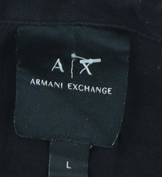 Discover stylish ease with this Men's Armani Exchange Black Polo Shirt. Crafted from 100% cotton, this polo provides a classic fit that complements all-day wear. The smooth black colour paired with a solid pattern and iconic Armani Exchange logo accent conveys sophistication in simplicity. Suitable for casual occasions, it features a classic collared neckline with a button closure, ensuring a timeless look. Short sleeves add to its relaxed vibe, making it perfect for any season. Despite minor wear noted around a small hole on the front, this polo remains in good condition, offering a chic option for wardrobe staples. Easy to care for and machine washable, it promises convenience. Ideal for those seeking both comfort and fashion.