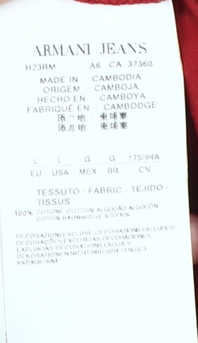 Make a bold fashion statement with this striking Armani Jeans red sleeveless T-shirt, accentuated by the iconic large '81' design on the front. Crafted with comfort in mind, this T-shirt's 100% cotton composition ensures a breathable and soft fit, ideal for the summer season. The jersey fabric offers a relaxed feel, perfect for casual outings or sporting activities. The round neckline adds a classic touch, blending easily into any wardrobe while providing a unique presence. Ideal for those who appreciate quality and style, this Armani Jeans piece is a must-have addition to your collection. Made with meticulous craftsmanship in Cambodia, it offers durability and modern flair, adhering to Armani's commitment to excellence. Elevate your everyday style with this remarkable top, perfect for layering or wearing solo. Whether you're heading to a casual event or enjoying a laid-back weekend, this garment will ensure you stand out effortlessly. Enjoy the prestige of wearing a new, unworn branded piece, complete with original tags, and experience the sophistication and reliability of the Armani Jeans label.