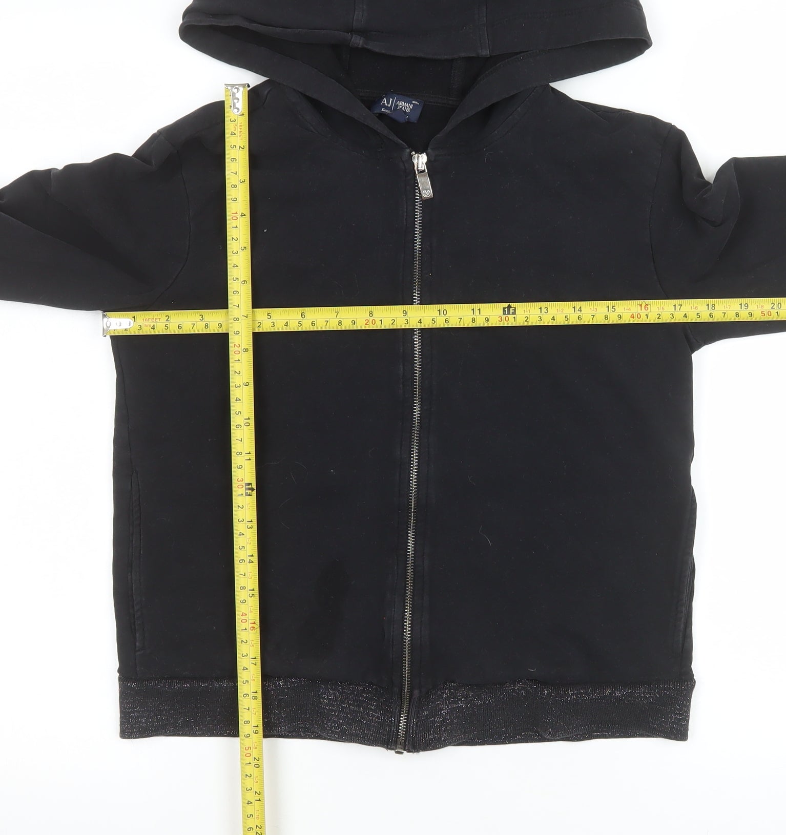 Step out in sleek sophistication with this Armani Jeans women's black hooded zip jacket, offering a perfect balance of designer flair and everyday comfort. Crafted from a soft and breathable cotton blend with a touch of elastane for added flexibility, this jacket provides an easy and flattering fit. The full front zip closure and ribbed hem and cuffs add both function and style, while the iconic Armani Jeans eagle logo on the back enhances its luxury appeal. The versatile black shade ensures it pairs effortlessly with casual and smart-casual outfits alike. Designed with long sleeves and a comfortable hood, it’s ideal for layering during cooler months or for throwing on during breezy evenings. The practical front pockets make it convenient for carrying essentials or keeping hands warm. Suitable for casual wear, travel, or relaxed outings, this piece embodies premium Italian craftsmanship with a classic modern edge. With subtle logo detailing and chic simplicity, this jacket easily complements jeans, leggings, or a midi skirt for a contemporary look. In very good pre-loved condition with light markings on the front fabric, it remains stylish and wearable. Machine washable for easy care, this piece combines practicality with lasting fashion cachet. Perfect for autumn, spring, and mild winter wear, this Armani Jeans jacket is a wardrobe essential for anyone looking to blend comfort with luxury design in an understated everyday piece.