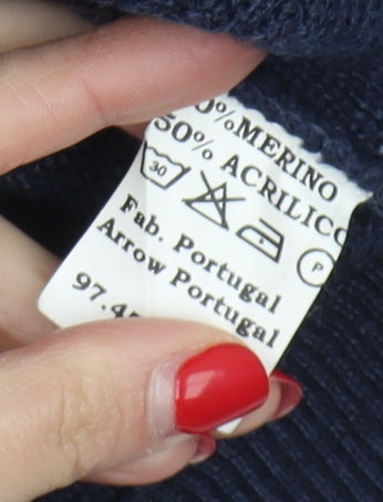 Discover comfort and style with this Arrow men's pullover jumper. Designed in a classic blue hue, this jumper is perfect for the modern gentleman who values both function and fashion. Crafted from a blend of wool and acrylic, the jumper offers warmth and softness, ideal for those colder autumn and winter days. Its tight-knit fabric ensures durability, while the high neck design adds an element of sophistication and additional warmth. The 1/2 zip feature allows you to adjust your warmth and style effortlessly. Size L fits comfortably for a classic look, ideal for various body types. Crafted for casual occasions, it seamlessly pairs with jeans or chinos for an effortless look. The jumper is machine washable, offering convenience and ease of care. Elevate your wardrobe staples with this exceptional piece from Arrow, a brand synonymous with quality and timeless design.