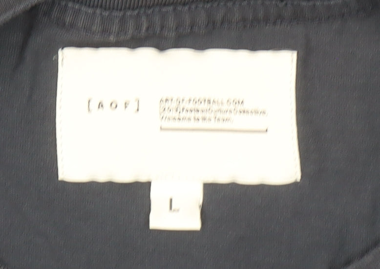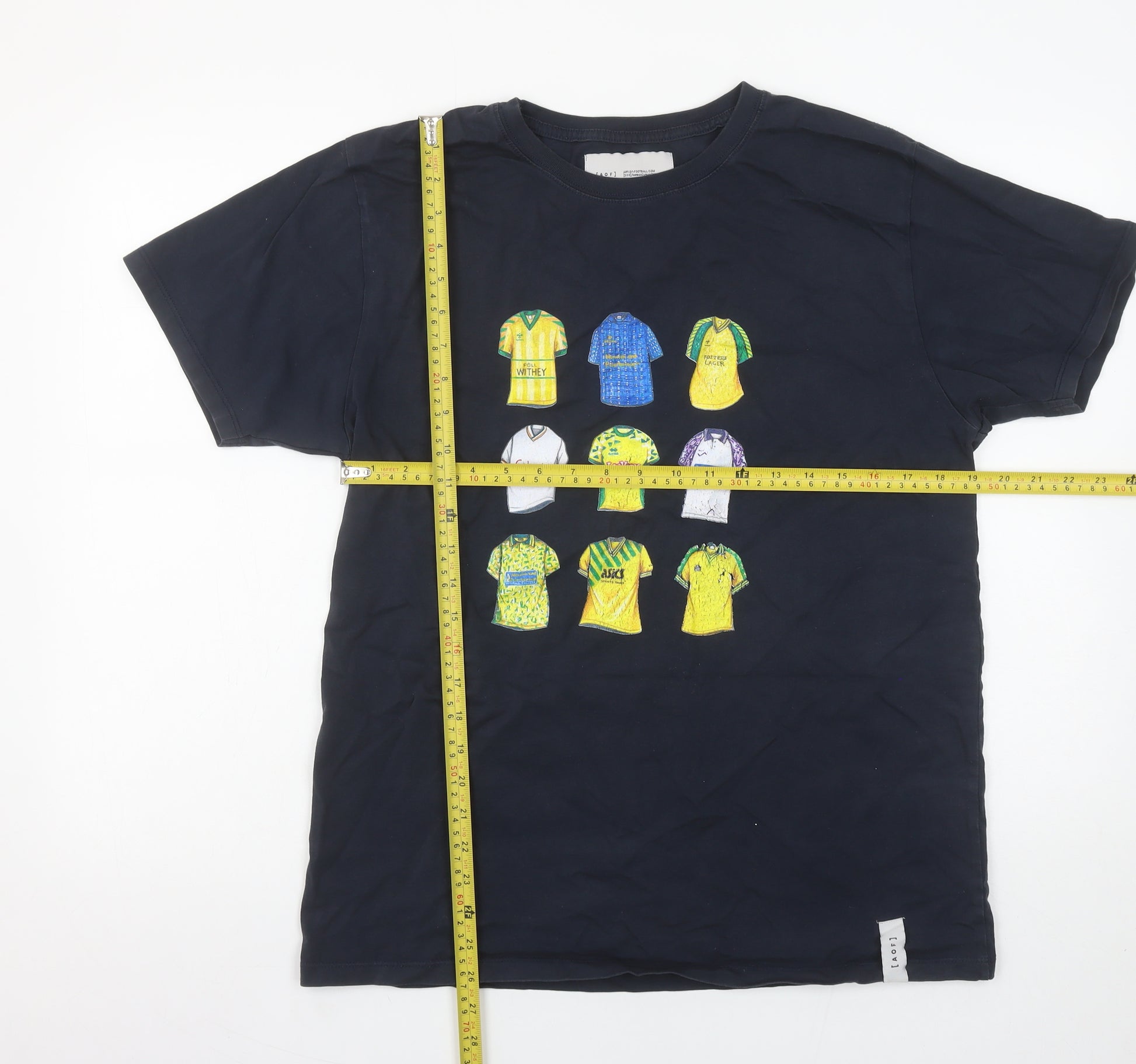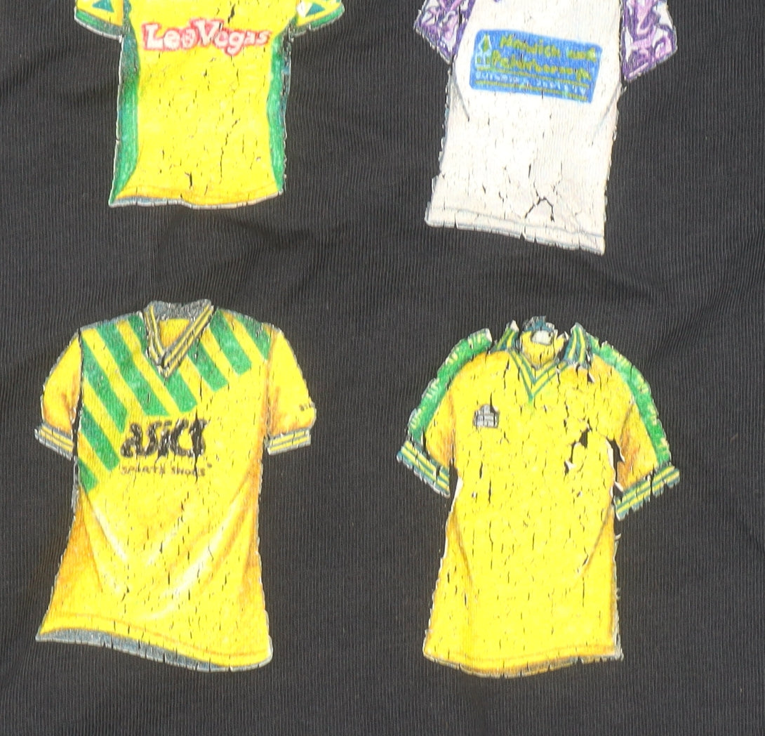 Celebrate your passion for the game with this Art of Football men’s black graphic T-shirt. Crafted from 100% organic cotton for a soft, breathable feel, this regular fit tee combines comfort and creativity. The front features a vivid graphic design of classic football shirts, paying tribute to iconic kits across the decades – the ideal choice for any passionate supporter or lover of football-inspired fashion. The crew neck and short sleeve design ensure easy everyday wear, while the premium jersey fabric lends durability and softness. Certified by the Global Organic Textile Standard (GOTS), it’s made sustainably with quality you can see and feel. This versatile black tee pairs effortlessly with jeans, shorts, or joggers, making it perfect for casual days, watching the match, or showing your football heritage in streetwear style. The Art of Football label at the hem adds a finishing designer touch. In very good condition with minor cracking on the print, this T-shirt remains full of character and ready for many more wears. Add a touch of sporting nostalgia to your wardrobe with this timeless football-inspired design – a must-have for collectors and casual fans alike.