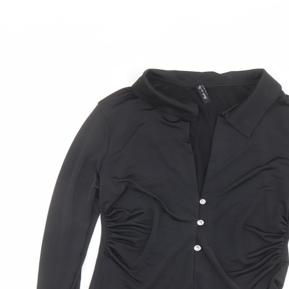 Womens Black Polyester Basic Button-Up Size 10 Collared - Ruched Detail