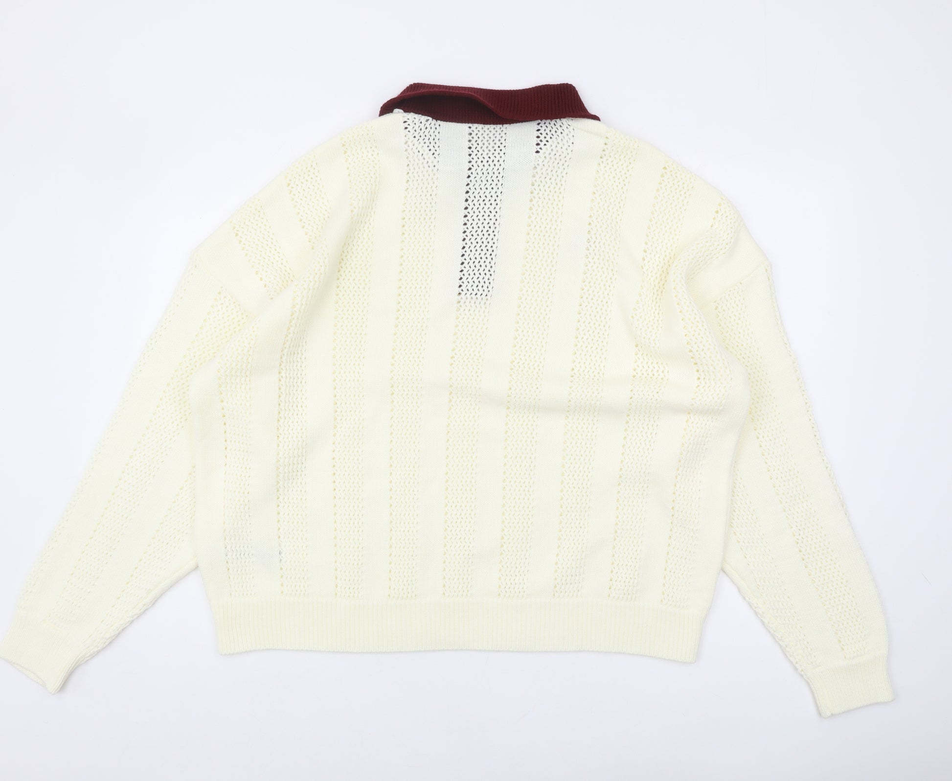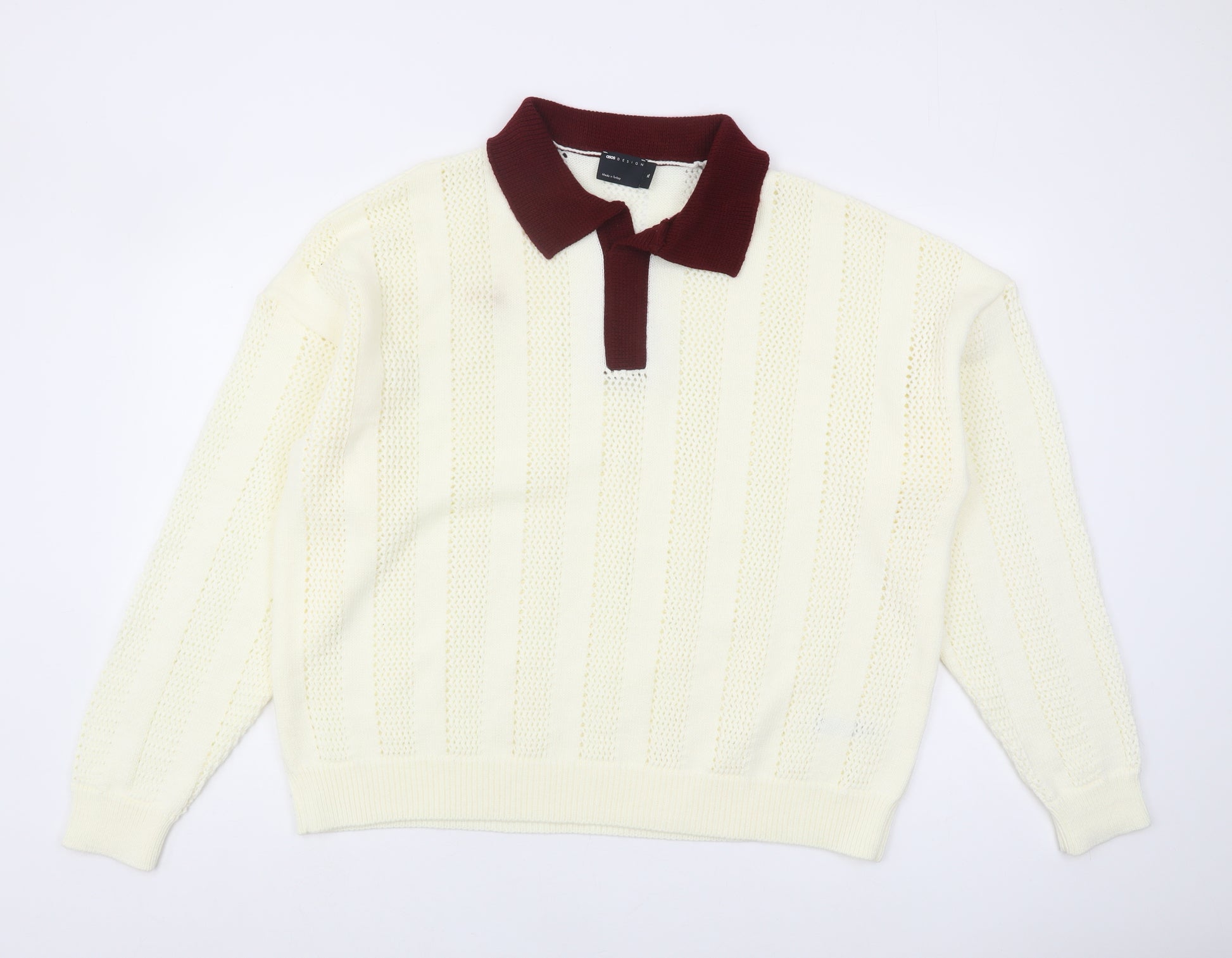 Discover this stylish ASOS DESIGN men's pullover jumper in a sophisticated ivory shade, ideal for adding a touch of class to any outfit. Designed with a regular fit, this XL jumper ensures comfort and style for all seasons. Featuring a collared neckline and crafted from 100% acrylic, it combines a premium feel with the practicality of being machine washable. The open-knit style adds a modern twist to the classic look, making it perfect for casual occasions or dressing up for a finer touch. Its long sleeves and absence of patterns enhance its versatility, allowing you to pair it effortlessly with various trousers and shoes. Whether you're heading out for a casual day or dressing warmly for a cooler evening, this men’s jumper is your go-to piece for an effortlessly stylish look. Despite being a slightly used item, it remains in excellent condition, ready to become a staple in your wardrobe. Don’t miss the chance to own this classic, timeless piece that combines form and function seamlessly.