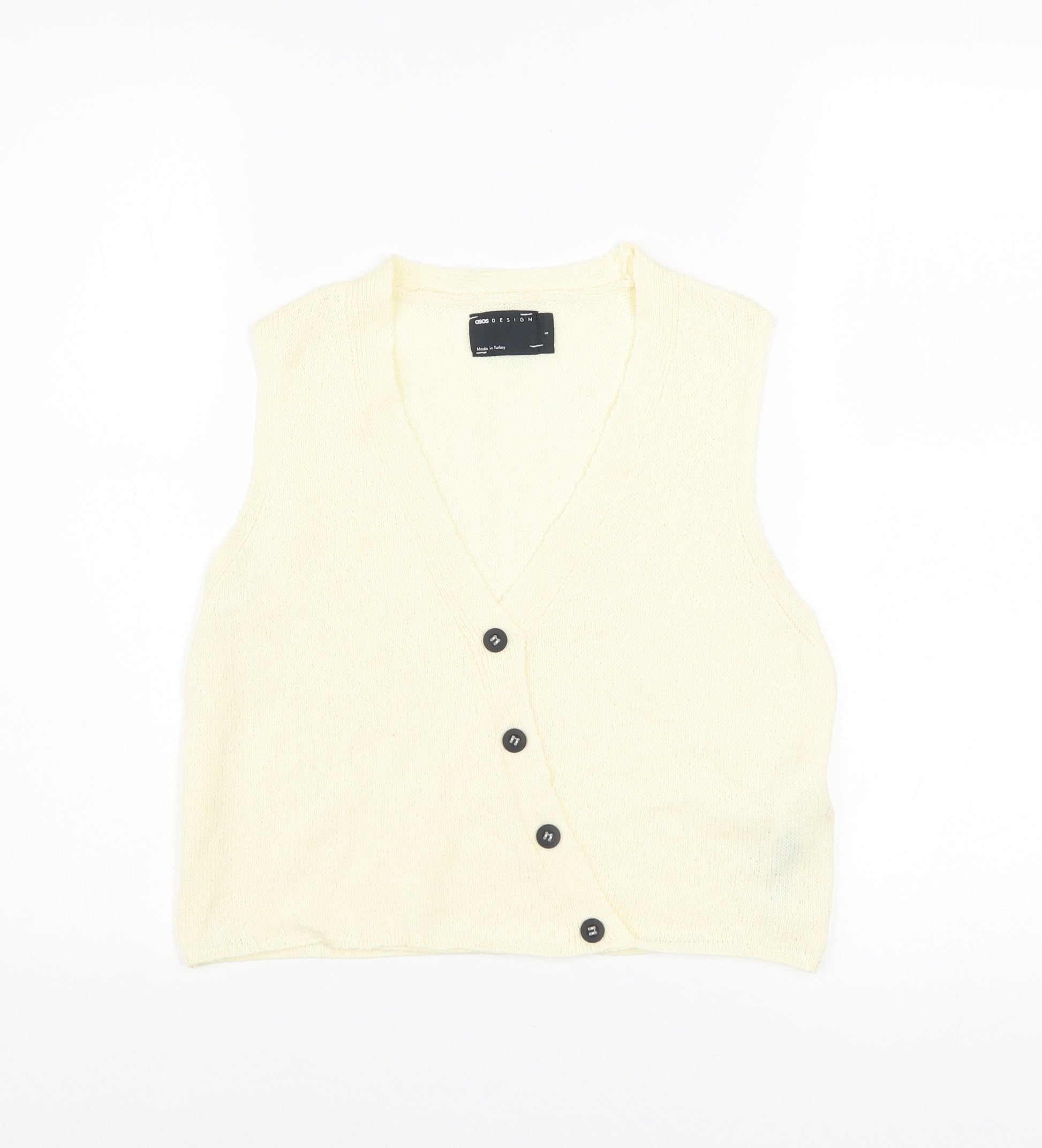 Add effortless style to your wardrobe with this chic ASOS DESIGN women’s ivory knit vest jumper in size Small. Crafted from 100% polyester, the lightweight knitted fabric offers a soft and comfortable feel, making it perfect for layering across seasons. The sleeveless design, deep V-neckline, and five-button detailing along the front create a flattering, modern silhouette that works beautifully over shirts, blouses, or even on its own for a minimalist aesthetic. Ideal for spring and summer wear, this piece can easily transition into autumn when paired with long-sleeve tops or jackets. The clean ivory tone makes it a versatile addition to your collection, coordinating effortlessly with both smart and casual outfits. Designed for a regular fit, it provides a polished yet relaxed appearance suitable for everyday casualwear, coffee dates, or creative work settings. The fine tight-knit texture ensures a sleek finish, while the open buttoned front adds subtle visual interest. Manufactured in Turkey under ASOS’s contemporary label, this jumper embodies quality, easy care, and understated elegance. In very good used condition with only a faint mark on the back, it remains a fashionable choice for anyone looking for a lightweight layering staple. Whether teamed with jeans, trousers, or skirts, this vest jumper exudes a timeless charm that complements nearly every personal style. Machine washable for ease of care, it represents a great balance of comfort, durability, and stylish simplicity. Update your outfit lineup today with this ASOS DESIGN ivory knit vest — a must-have essential for those who value both design and practicality.