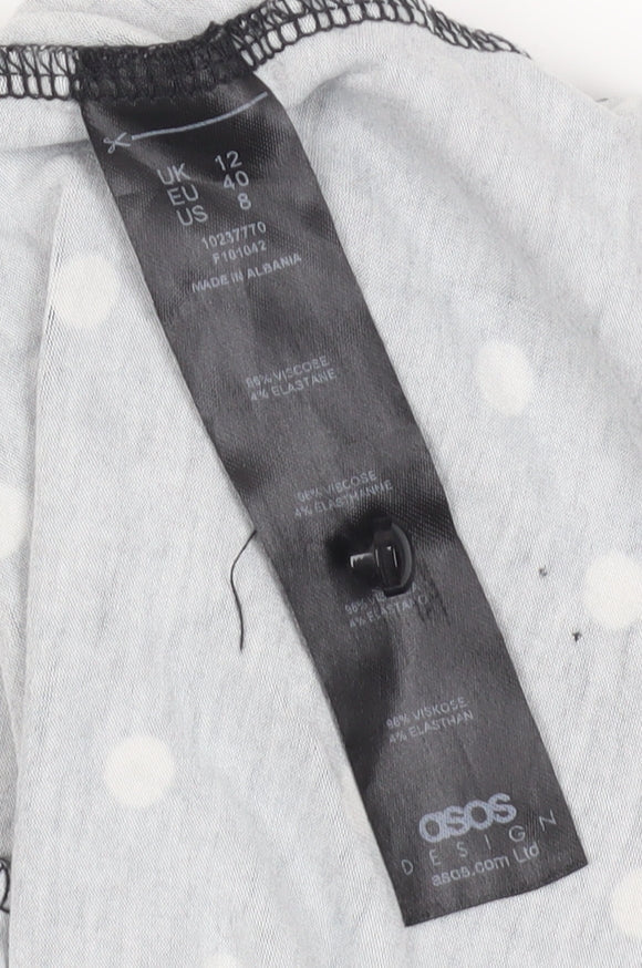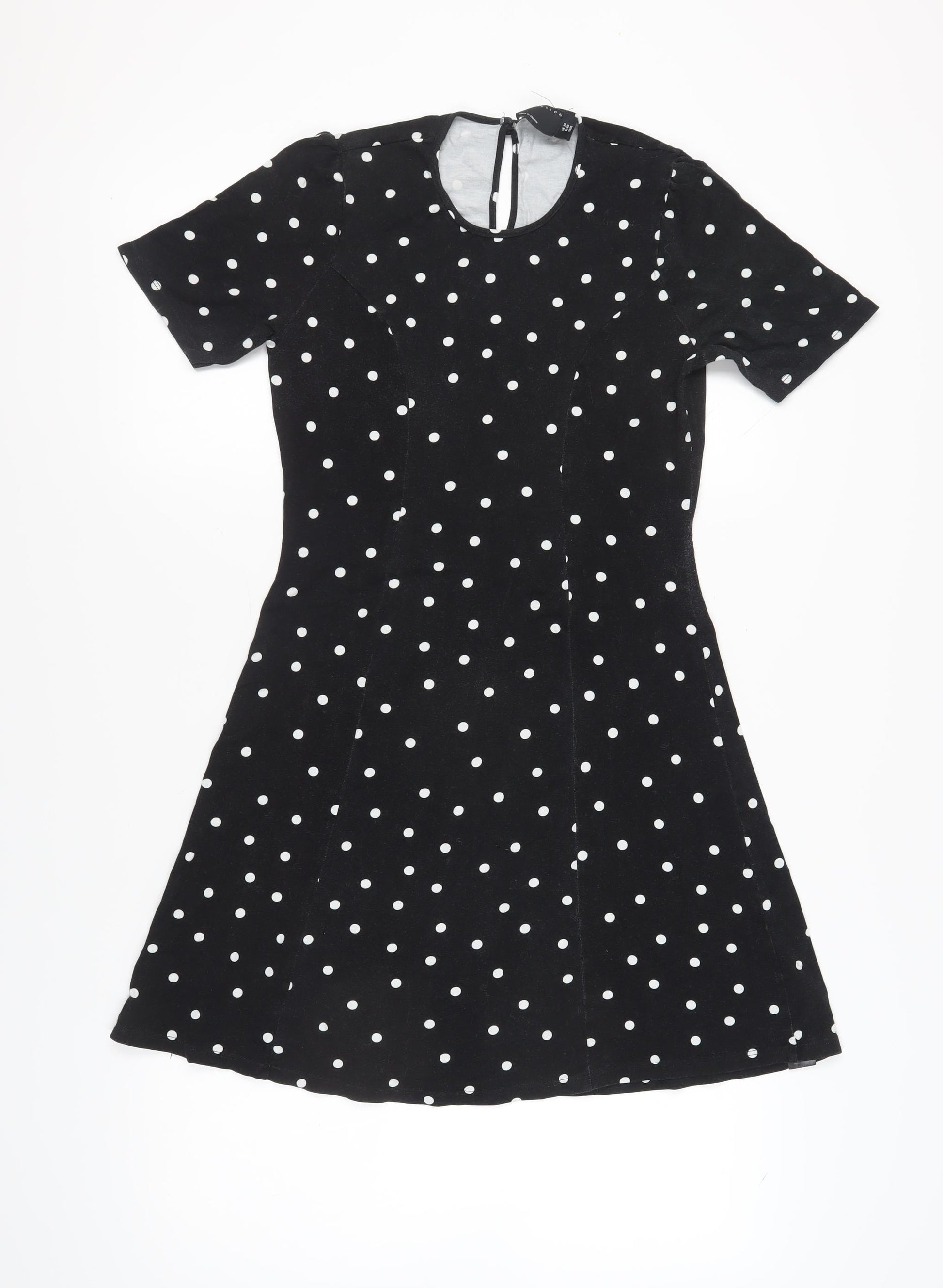 Make a stylish statement with this ASOS DESIGN black polka dot dress, perfect for any fashion-forward woman. Expertly crafted from a blend of viscous and elastane, this dress offers comfort and a flattering fit. The knee-length cut is ideal for both casual and semi-formal occasions, promising versatility in your wardrobe. Featuring short sleeves and a round neckline, it adds a touch of classic charm. Despite slight wear, its overall excellent condition ensures you can enjoy it for many occasions to come. Dare to stand out with this chic addition to your collection.