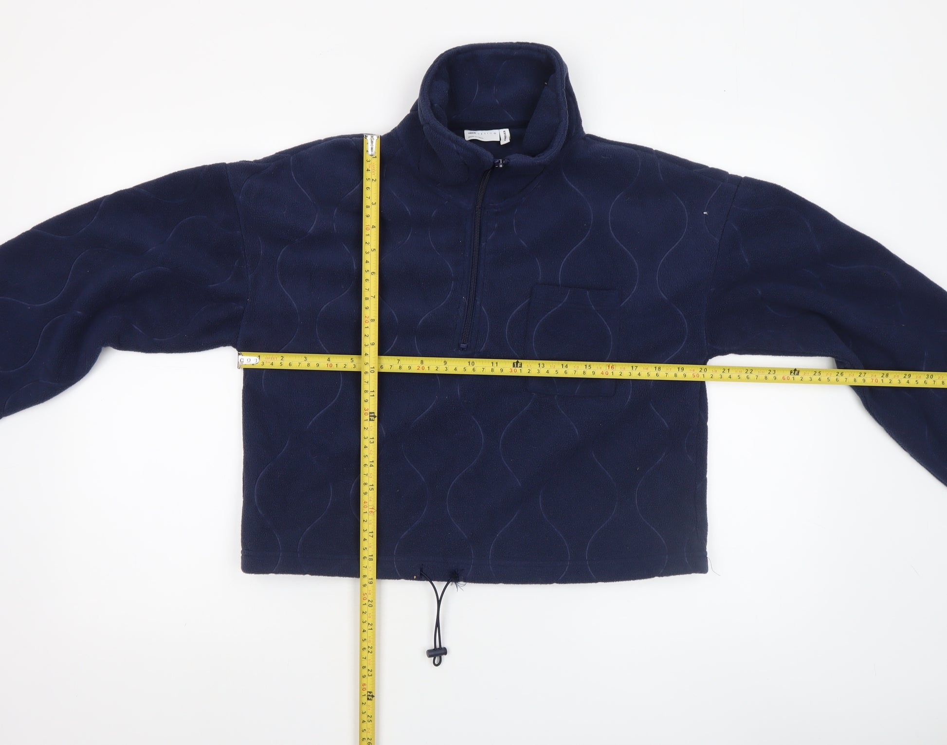 Keep cosy and stylish with this ASOS Design women's navy fleece pullover sweatshirt. Crafted from 100% polyester fleece, this soft and warm top is ideal for cooler days throughout autumn and winter. The relaxed fit and cropped length combine for a modern silhouette, while the adjustable drawstring hem ensures a personalised fit and helps lock in warmth when the temperature drops. Designed with a functional quarter zip front for easy wear, it features a high neck that adds a chic, contemporary look and extra protection against the chill. The long sleeves come with elasticated cuffs for comfort and a snug feel. Perfect for layering, this fleece works equally well for everyday casual wear, weekend walk outings, or outdoor adventures such as hiking or camping. Its minimalist design is easy to pair with jeans, joggers, or leggings, making it a versatile wardrobe essential. The lightweight fabric makes it breathable enough for transitional weather, while its navy blue tone adds timeless appeal to your outfit. With a chest size of approximately 20 inches, this piece is comfortably sized as a UK M, suiting women who appreciate easy, relaxed styling. In excellent pre-owned condition, showing only light signs of wear with no visible damage, this ASOS Design sweatshirt remains a smart choice for comfort and practicality without sacrificing style. Whether you’re headed out or relaxing at home, this fleece pullover will keep you feeling warm and looking effortlessly trendy.