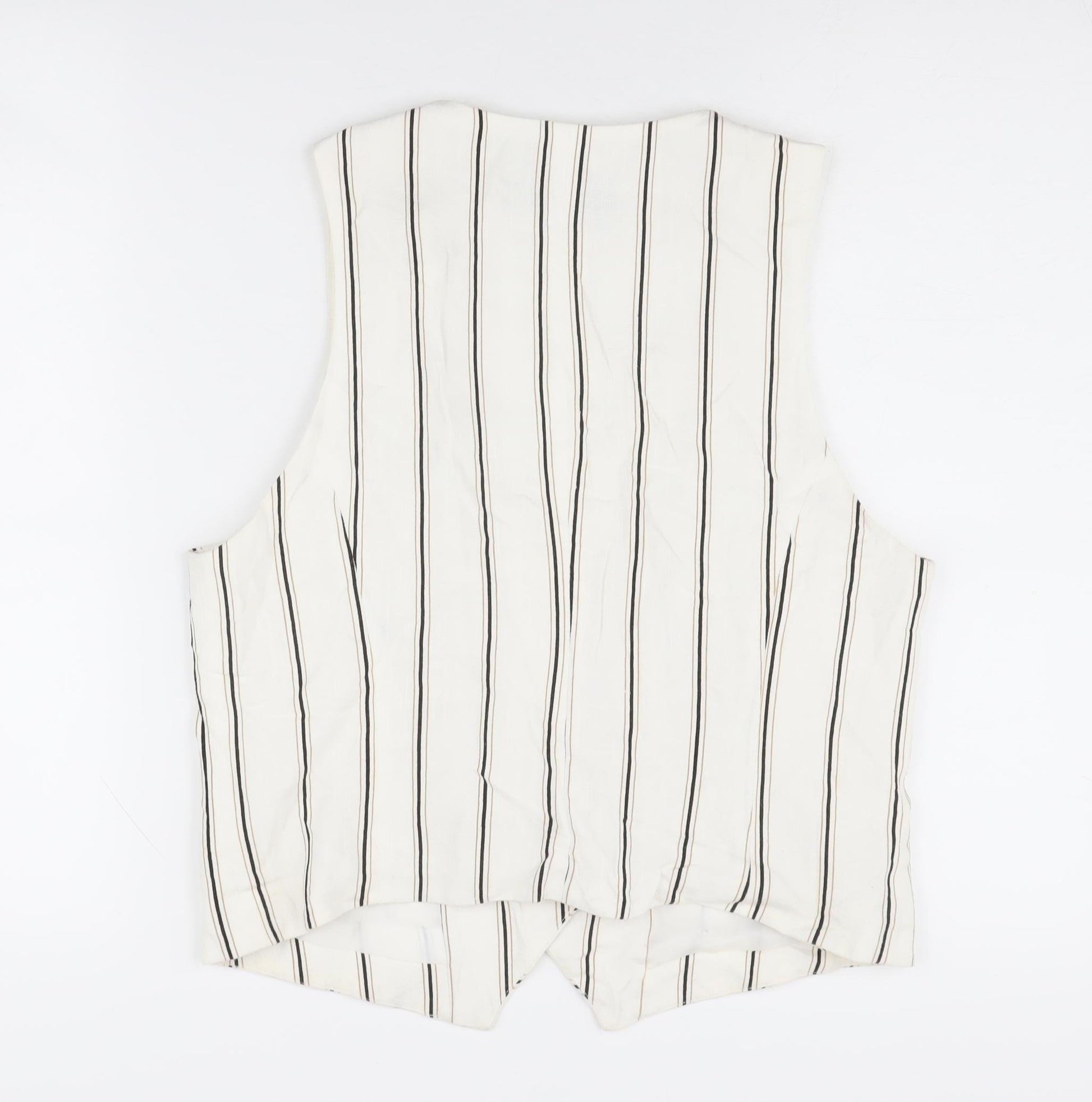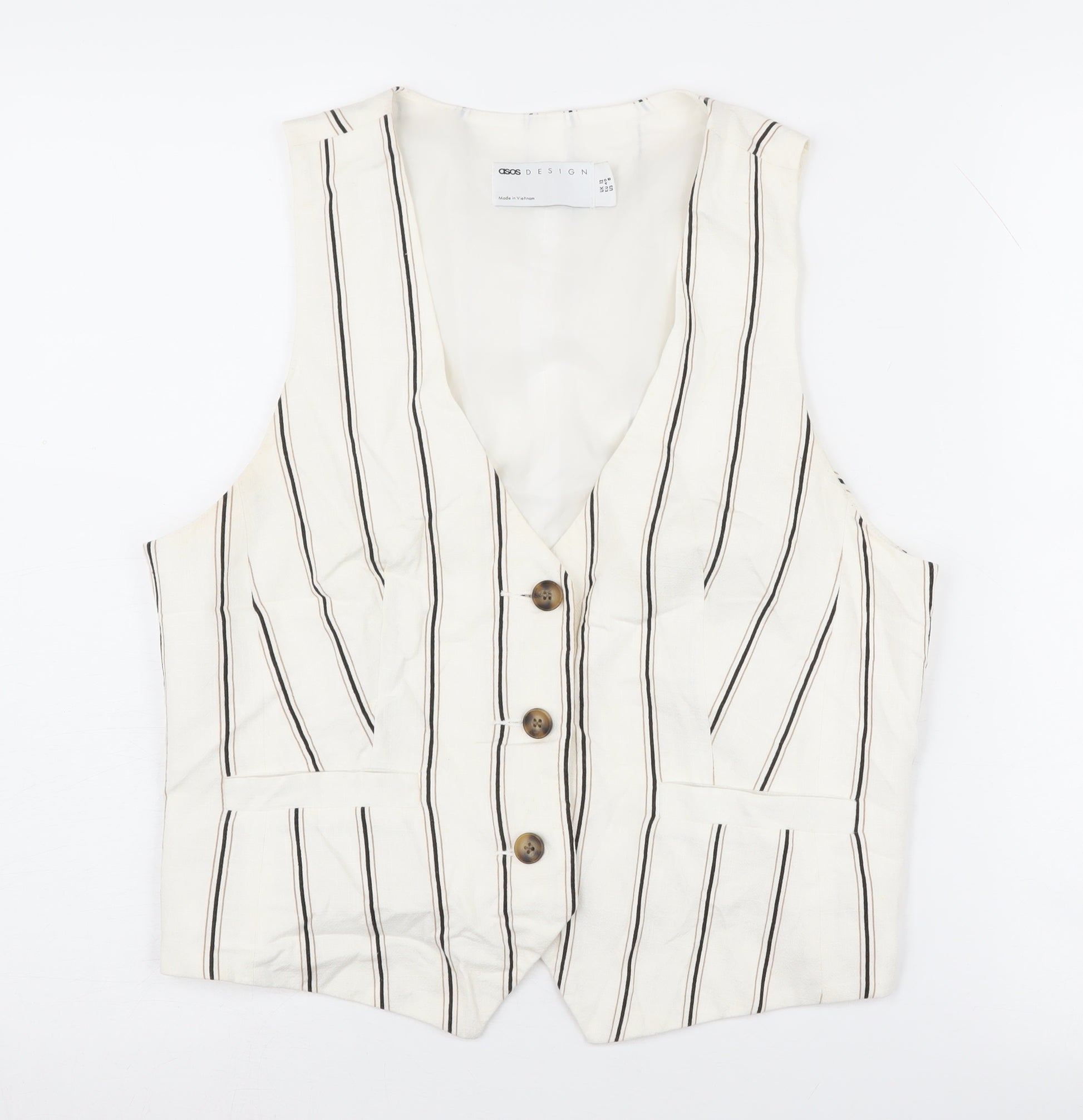 Elevate your wardrobe with this stylish ASOS DESIGN women's waistcoat in a timeless white hue with a chic striped pattern. Crafted for sophistication, this waistcoat comes in a regular size 12, making it a perfect addition to your formal or casual ensemble. Made from a comfortable and breathable blend of 81% viscose and 19% linen, the waistcoat ensures both comfort and elegance. Its polyester lining adds durability without compromising on style. The sleek design features a classic three-button front, offering a touch of modernity to your outfit. As a sleeveless piece, it allows for versatile layering, providing options for both cooler and warmer days. This waistcoat, in its pristine new condition, is ideal for those seeking a fresh addition to their collection. Pair it with trousers or a skirt to create a statement look, perfect for business meetings or an elegant evening out. The ASOS DESIGN brand ensures quality and attention to detail, making this waistcoat a must-have. Don't miss out on this opportunity to own a beautifully crafted piece that promises to be the highlight of your wardrobe. Its refined simplicity and excellent tailoring are sure to turn heads and garner compliments wherever you go. A truly versatile piece, it's a smart investment for any fashion-forward individual.
