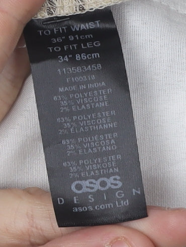 Enhance your wardrobe with these versatile ASOS men's beige check chino trousers. Designed for the modern man, these trousers offer a stylish chino fit in a classic beige colourway, paired with a check pattern for a touch of sophistication. Tailored for comfort, they come in a regular size with a waist of 36 inches and an inside leg of 34 inches, ensuring a perfect blend of style and functionality.Crafted from a durable blend of materials including 63% polyester, 35% viscose, and 2% elastane, these trousers promise both comfort and endurance. The tapered leg style and flat front design provide a contemporary silhouette, perfect for casual settings. Equipped with belt loops and a belted feature, these chinos allow for personalized styling to suit your fashion preferences.Ideal for autumn and spring wear, these trousers are machine washable for easy maintenance, making them a convenient addition to your everyday attire. Although pre-loved, their condition remains good with a minor mark on the leg, offering a fantastic opportunity to own quality ASOS fashion at an affordable price. Pair them with a crisp shirt or casual tee for effortless sophistication.These trousers embody a perfect marriage of style and practicality, making them an excellent choice for casual occasions or a relaxed day at the office. Don’t miss the chance to add them to your collection. Ideal for those seeking style and comfort, these trousers are a wardrobe staple. Order now to experience ASOS's renowned quality and design firsthand.