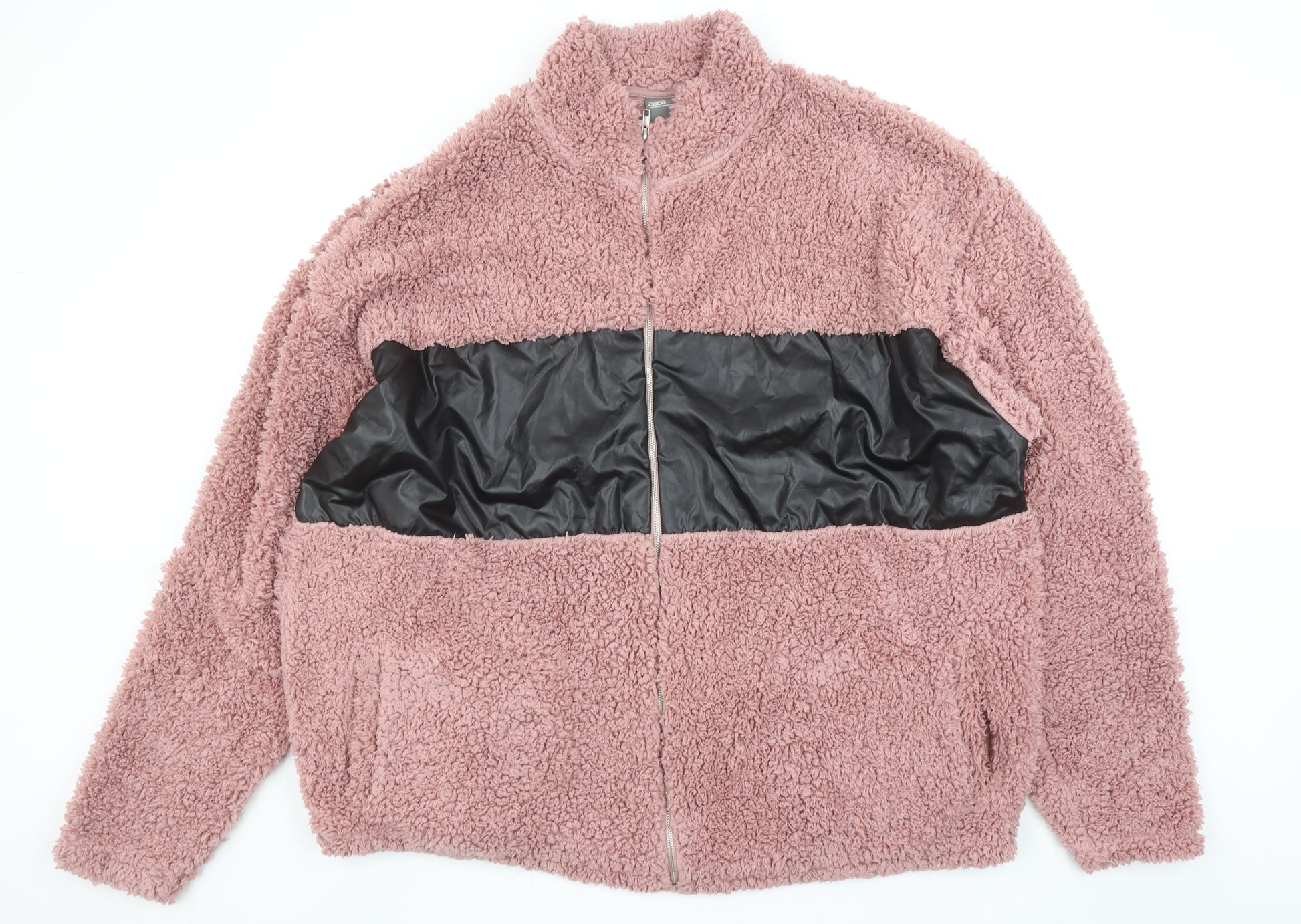 Wrap up in cosy style with this ASOS women's pink faux shearling bomber jacket. Crafted from soft fleece fabric, it features a plush texture that delivers warmth and comfort, perfect for autumn and winter days. The jacket has a full-zip closure and a contrasting black panel across the chest, adding a contemporary edge to its relaxed silhouette. Made from 100% polyester with a cotton blend lining for added comfort, it offers practicality alongside its standout design. The relaxed fit allows easy layering over your favourite jumpers and tops, making it an ideal piece for casual outings, chilly morning walks, or laid-back weekends. This jacket includes handy front pockets and a high collar to keep out the cold, combining functionality with a fashionable look. Designed for plus-size women, it provides an effortless fit that maintains style without compromising on comfort. Pair it with jeans, trainers, and a simple tee for an instantly on-trend outfit. In excellent condition with minimal signs of previous use, this ASOS jacket remains clean and well-kept, ready for its next wardrobe. Whether you're heading out for errands or dressing down for the weekend, this fleece bomber jacket is an easy-to-wear essential that promises style and warmth throughout the cooler months. A great choice for those who love versatile layering and cosy textures.