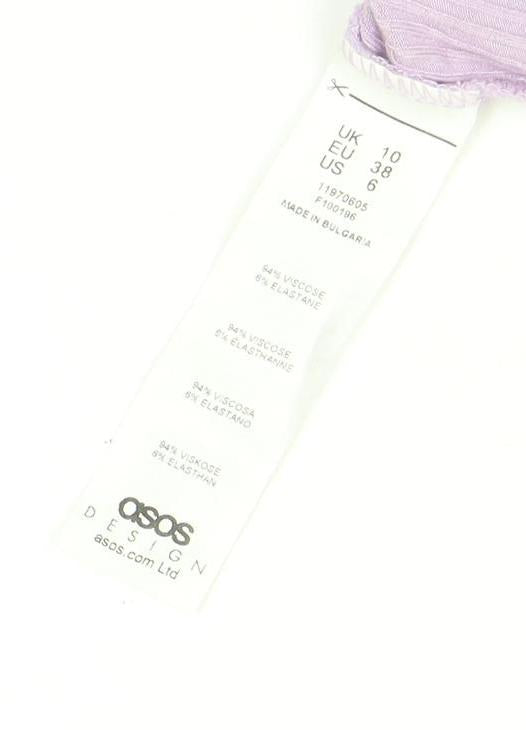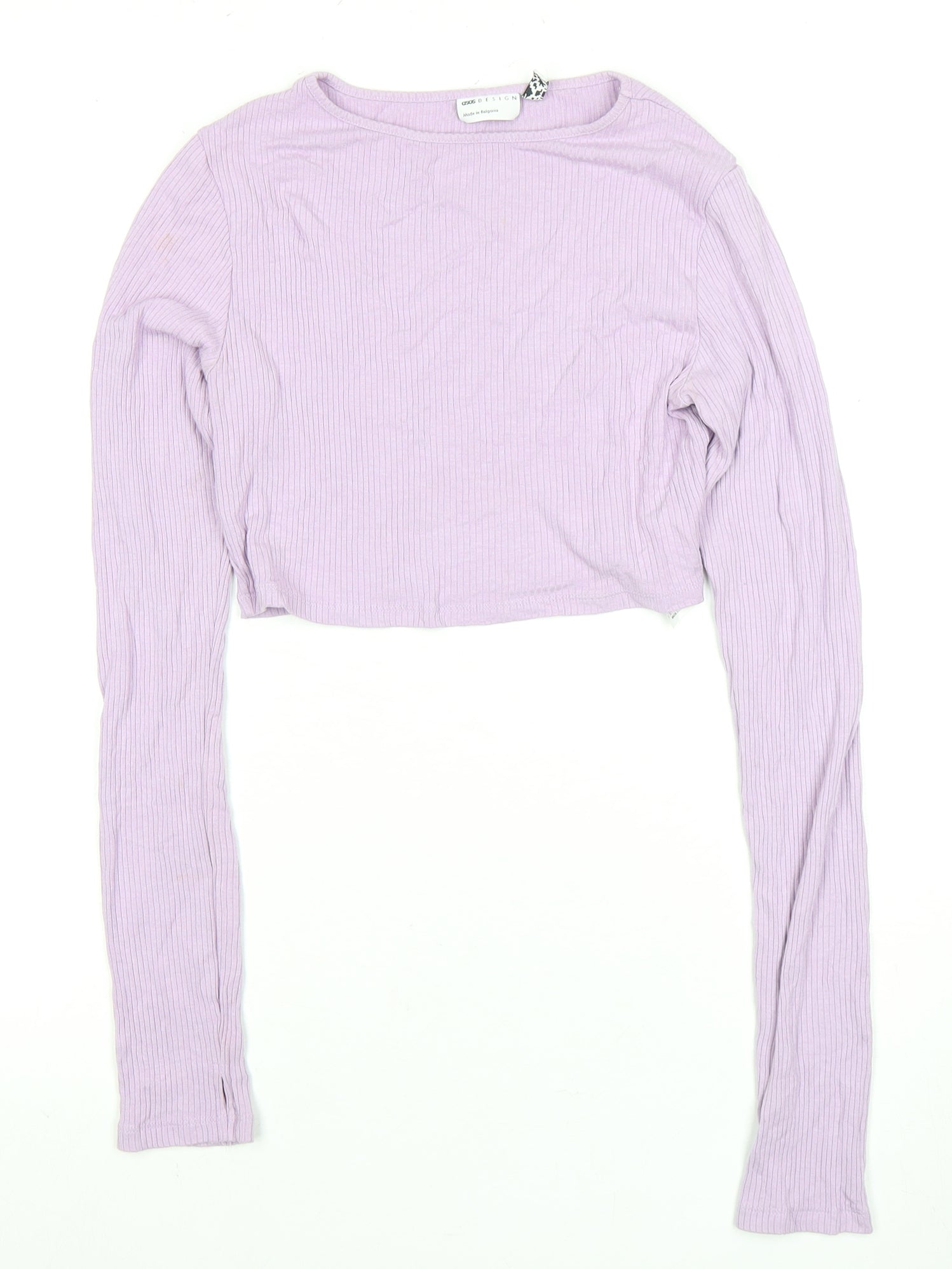 This stylish ASOS women's cropped top, designed in a subtle purple hue, is a perfect blend of fashion and comfort. Crafted from a soft knit fabric, this top combines 94% viscose and 6% elastane, ensuring a snug yet flexible fit. The long sleeves make it a versatile piece for both spring and summer, providing just the right amount of coverage while preserving breathability. The slim fit contours your body beautifully, accentuating your figure without compromising on comfort.The top features a round neckline, adding a classic touch to its trendy cropped style. Its pullover design makes it easy to wear, ideal for casual outings or laid-back weekends. Pair it with your favourite jeans or a high-waisted skirt to create a chic, effortless look.This garment, suitable for regular size wearers, is machine washable, promising convenience along with style. Despite being in very good used condition, it maintains its quality and appeal, offering an excellent addition to your wardrobe at a great price. Discover the perfect blend of casual elegance and contemporary fashion with this ASOS top, designed to elevate your style with minimal effort.