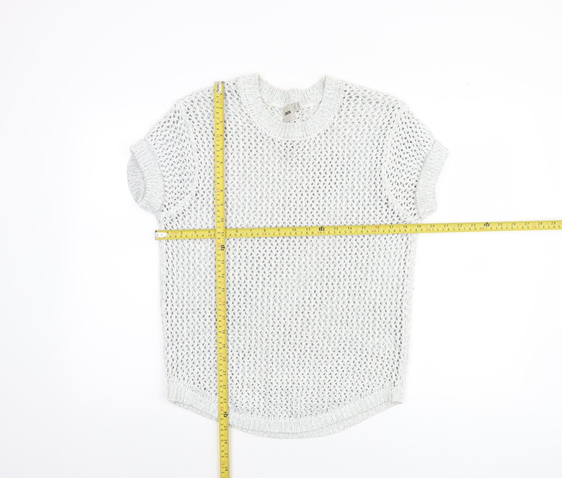 Step into effortless chic with this ASOS Women’s White Open-Knit Short Sleeve Jumper in size 10. Perfect for layering across the warmer seasons, this lightweight pullover is delicately crafted from a breathable blend of cotton and polyester with a touch of metallic fibre for a subtle shimmer. The open-knit design creates a relaxed yet polished look that transitions seamlessly from daywear to evening styling. The crew neckline and short sleeves offer a classic silhouette, while the rolled edges and airy structure bring a laid-back modern edge to your wardrobe. Ideal for pairing with jeans or layered over a camisole, this jumper works beautifully for spring and summer days when you want a balance of comfort and understated elegance. The soft cotton ensures all-day comfort, while the added polyester provides durability and shape retention. Perfect for casual gatherings, relaxed weekends, or summer holidays, this versatile piece captures effortless fashion at its best. In excellent pre-owned condition, there are no visible marks or signs of heavy wear. Machine washable for easy care, it’s a practical and stylish staple for any woman's collection. Whether dressed up with tailored shorts or worn loosely over a denim skirt, this ASOS open-knit jumper brings a hint of texture and casual sophistication to your look. Add this timeless yet modern piece to your wardrobe and enjoy the confidence of style that’s as airy as it is flattering.