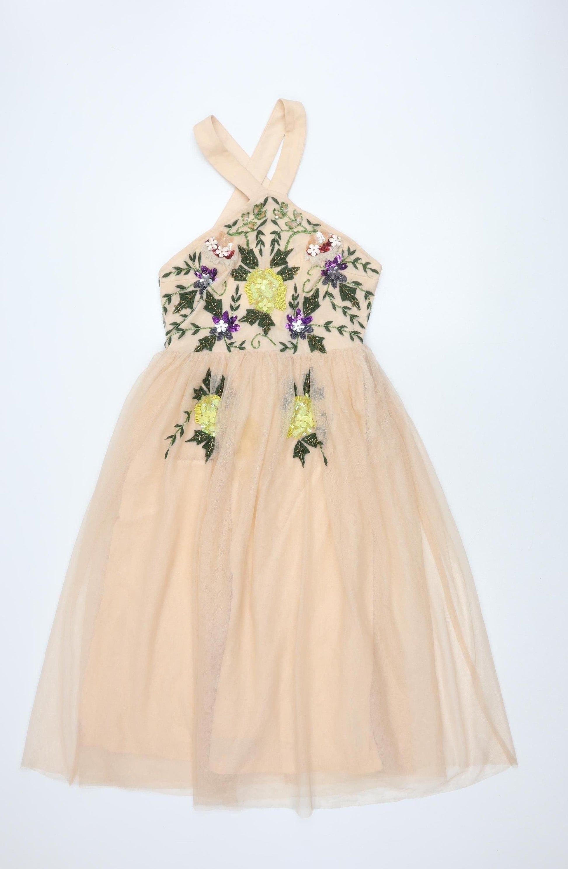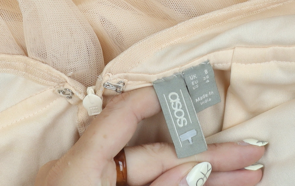 Elevate your wardrobe with this chic ASOS A-line midi dress, perfect for party and cocktail occasions. Crafted for a regular fit in size 8, the dress boasts a flattering V-neck and sleeveless design with strappy sleeves, enhancing its feminine charm. The exquisite beige mesh fabric accentuates the vibrant floral embroidery and sparkling sequins, adding an elegant touch to your ensemble. Its zip closure ensures a snug fit while keeping with the timeless A-line silhouette that complements any body type. Lined for comfort, this dress is ideal for spring and summer gatherings. Despite its elegant appeal, it offers easy wear and is designed to keep you looking fresh throughout the day or night. Pair it with your favourite heels and simple accessories to let the dress speak for itself. A definite must-have for any fashion-savvy individual's collection.