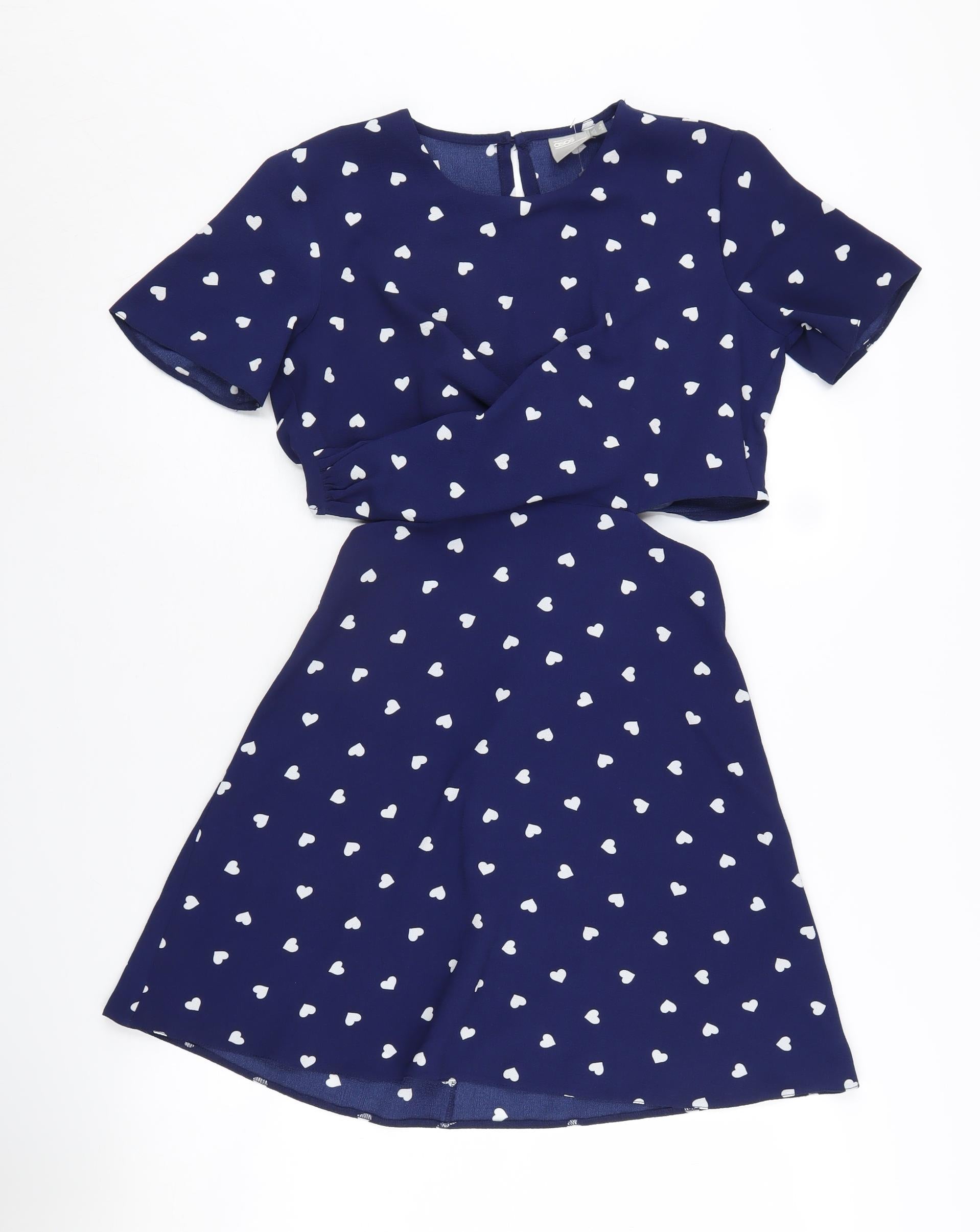 This ASOS women's dress is a must-have for anyone who loves style and comfort. Made from a blend of polyester and elastane for a perfect fit, this blue A-line dress features a playful heart pattern. With a short sleeve design and a convenient zip closure, it's ideal for a casual day out or a cocktail party. Embrace its versatility for spring and summer occasions. The dress is made from jersey fabric, ensuring a lightweight and breathable experience, and it's machine washable for easy care. Brand new with tags, this stylish piece is waiting to be a staple in your wardrobe.