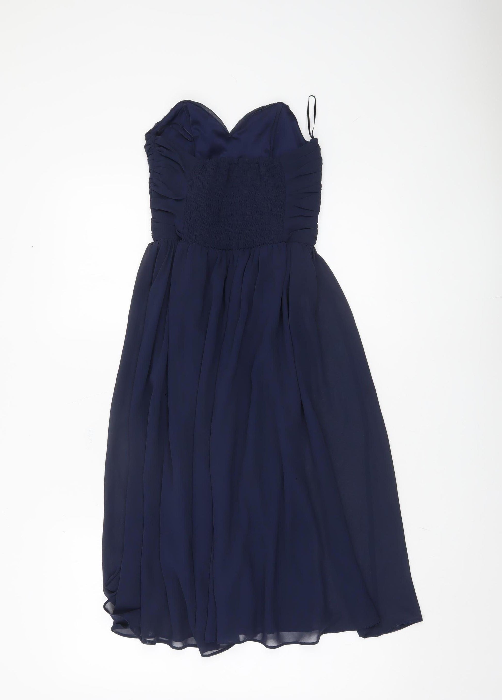 Discover elegance with this delightful ASOS Women's Blue Midi Fit & Flare Dress, Size 8. Perfect for formal occasions, parties, and weddings, this dress features a stylish sweetheart neckline and a chic strapless design. Crafted from light and flowy chiffon, the midi-length dress offers a flattering fit and flare silhouette enhanced by delicate ruffles. The ruched detail adds a sophisticated touch, making it an excellent choice for any special event. Made from 100% polyester, it ensures comfort and ease throughout your day or night. Pair this classic blue dress with your favourite accessories, and step into spring or summer in style. Don't miss out on adding this new, elegant piece to your wardrobe.