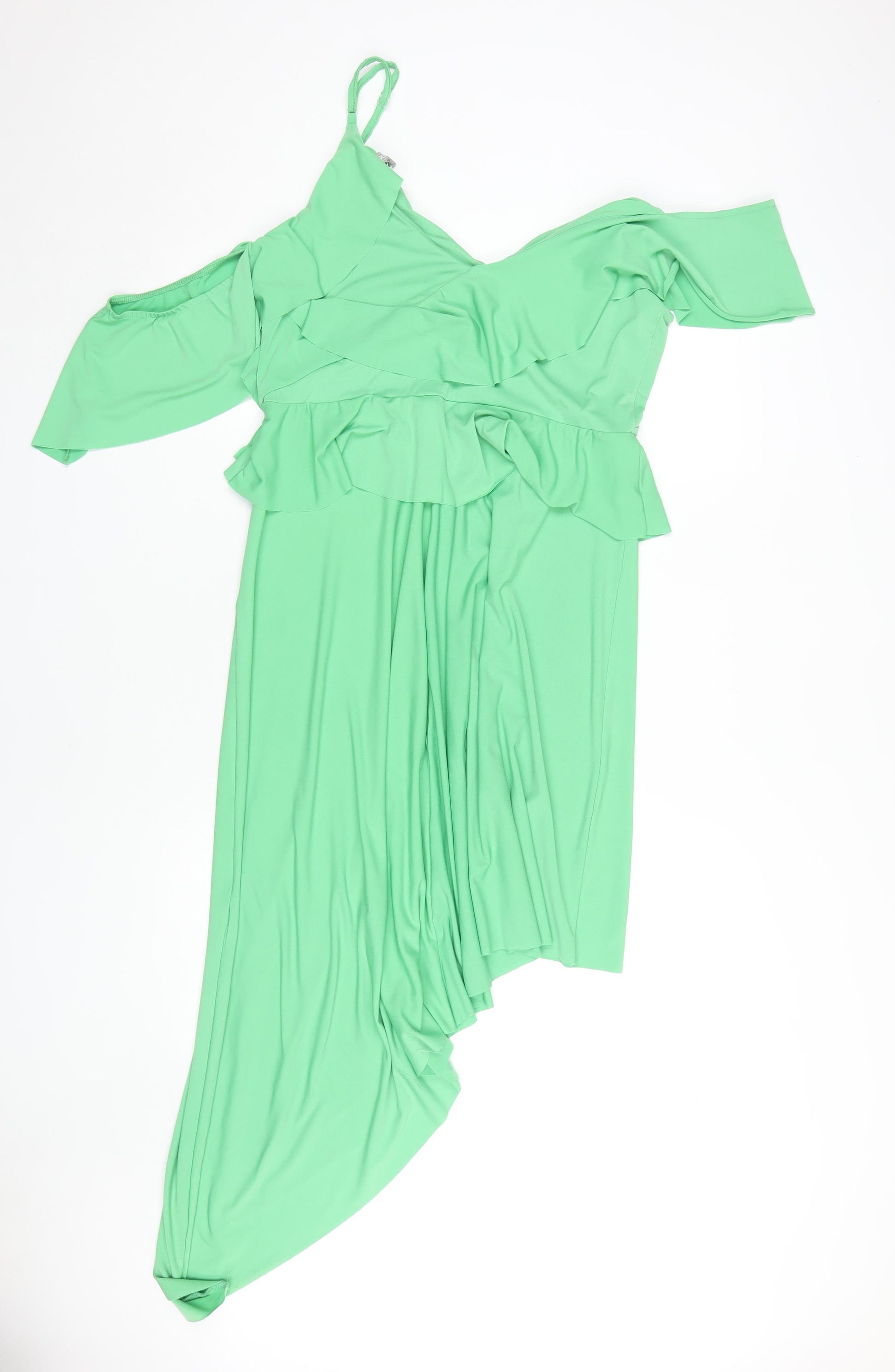 Introducing the stunning Asos Women's Green Asymmetric Dress, a stylish addition to any wardrobe that is sure to turn heads. Perfect for making a statement, this dress comes in a vibrant green hue that exudes confidence and elegance. Crafted from a comfortable jersey fabric, it combines 96% polyester with 4% elastane for a fit that moves with you while maintaining its shape. The design features an asymmetric hemline, lending a modern touch to this classic silhouette. A cold shoulder sleeve and one shoulder neckline add a unique flair, making it suitable for both casual outings and special occasions. The dress includes a zip closure for ease of wear and is accented with charming ruffles that enhance its feminine appeal. With its brand-new condition featuring original sales tags, this dress offers excellent value and style. Pair it with your favourite heels and accessories for a complete look that's ready for any occasion. Experience the blend of comfort and style with this fashionable Asos creation, perfect for those who love to stand out.