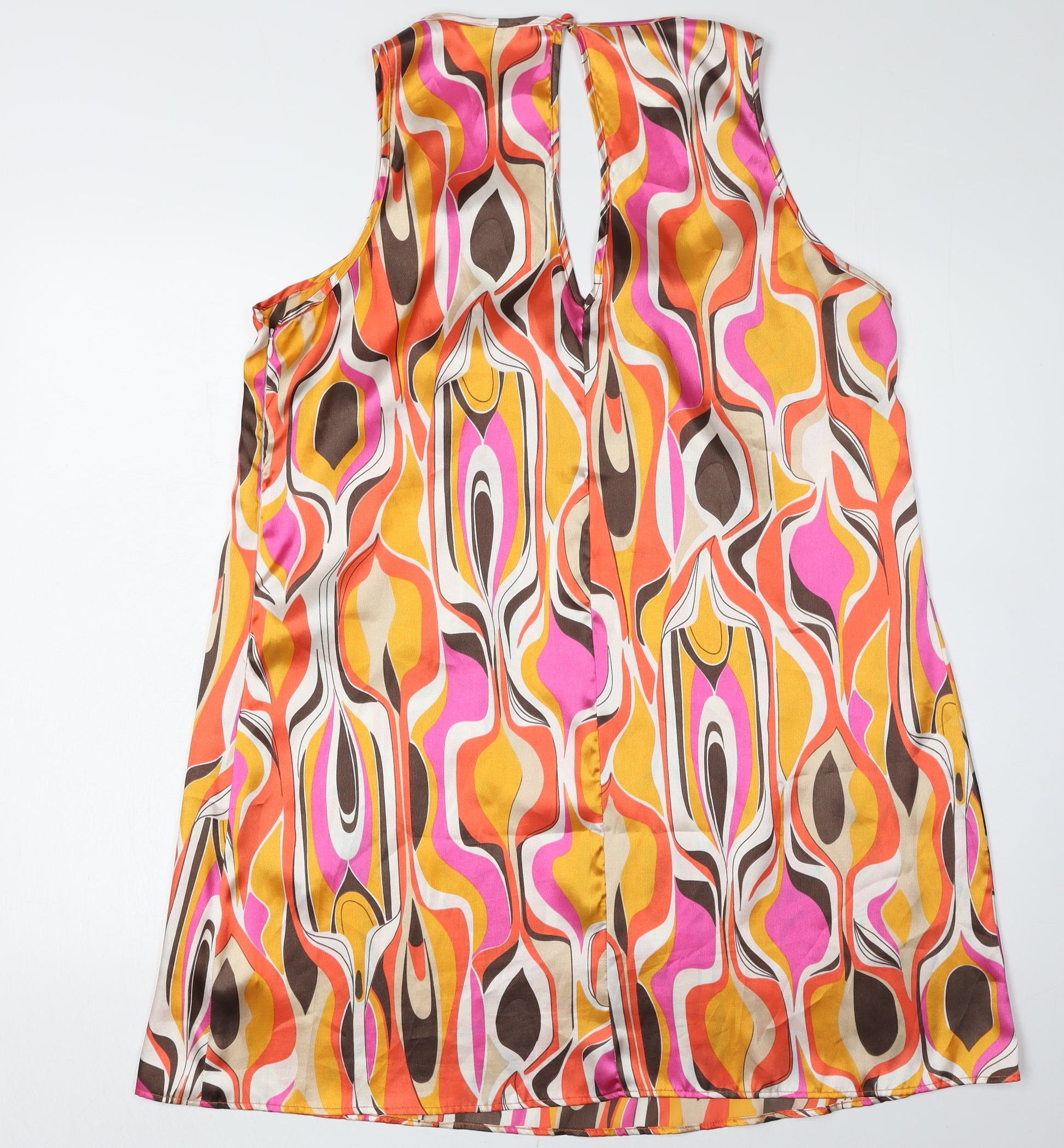 This vibrant multicoloured dress from ASOS is an eye-catching addition to any wardrobe. Designed for women, it features a bold geometric pattern that stands out with shades of orange, pink, yellow, and brown. The sleeveless design is perfect for warmer weather, making it an excellent choice for spring and summer occasions. Crafted from 100% polyester, the dress offers a lightweight and comfortable fit, ideal for casual outings or a relaxed party atmosphere. The woven fabric ensures durability, while the keyhole neck accent adds an elegant touch to the overall look. With a button closure at the back, ease of wear is ensured. Despite being in excellent condition, there are no visible tags, but rest assured of its quality and style. Machine washable for convenience, you can keep it looking fresh with minimal effort. Whether you're dressing up for a casual lunch or heading out for a day in the sun, this ASOS dress provides a colourful and chic option. A great addition for those who love vibrant styles and comfortable fits.