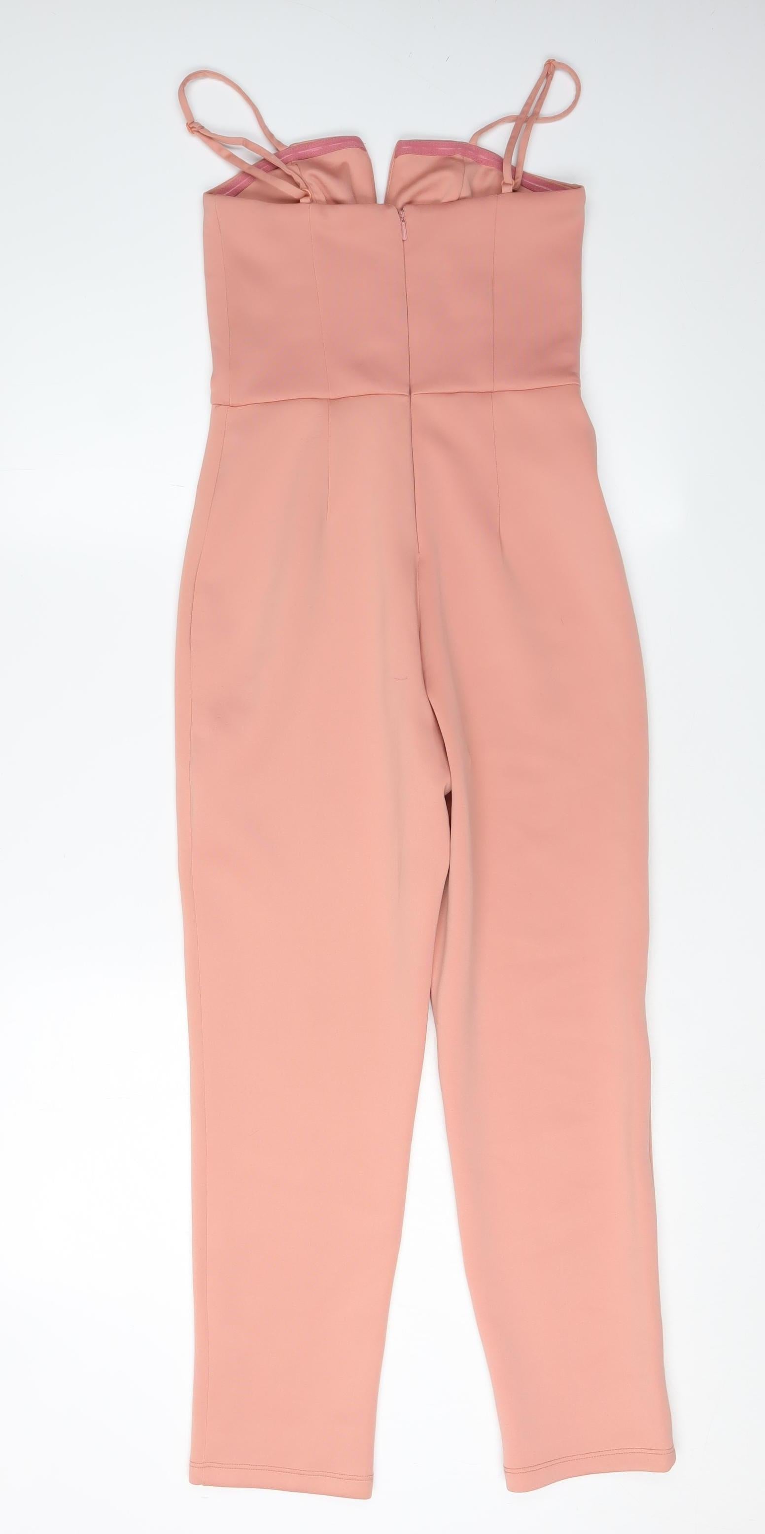 This chic ASOS women's jumpsuit in a flattering shade of pink is crafted in a blend of polyester and elastane for a comfortable fit. Its sleeveless design, with an elegant V-neckline and adjustable straps, ensures it complements any silhouette perfectly. Ideal for casual occasions, this straight-leg jumpsuit offers a modern and stylish look with a no-pattern elastic fabric that allows for flexibility and ease of movement. A subtle zip closure adds practicality to this versatile piece, making it suitable for various settings throughout all seasons. Despite a faint mark on the fabric, the piece remains in very good condition, reflecting its quality and durability. Machine washable for easy care, this jumpsuit promises comfort and elegance in one attractive package.