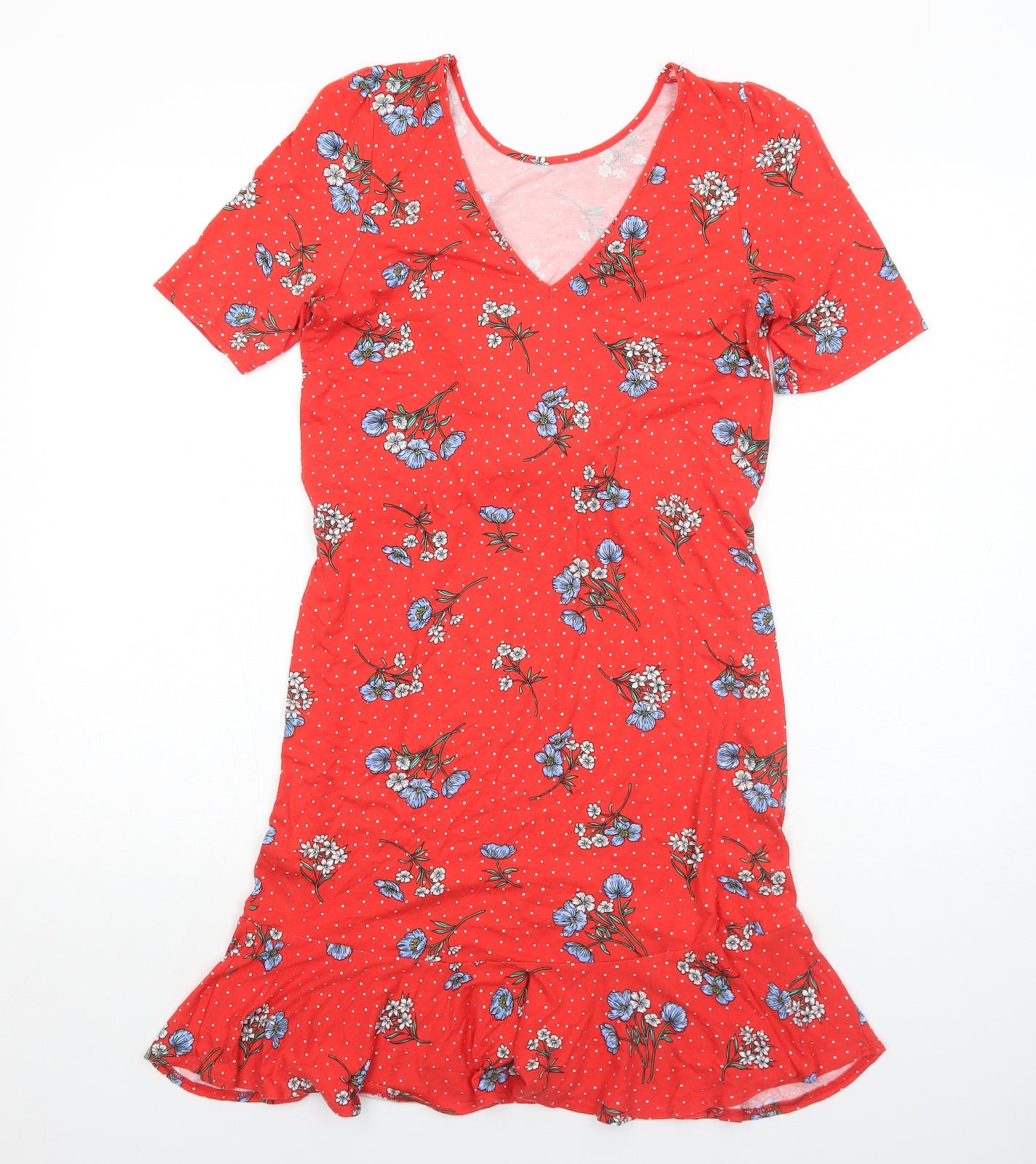 Womens Red Floral Viscose Fit & Flare Size 8 V-Neck Pullover