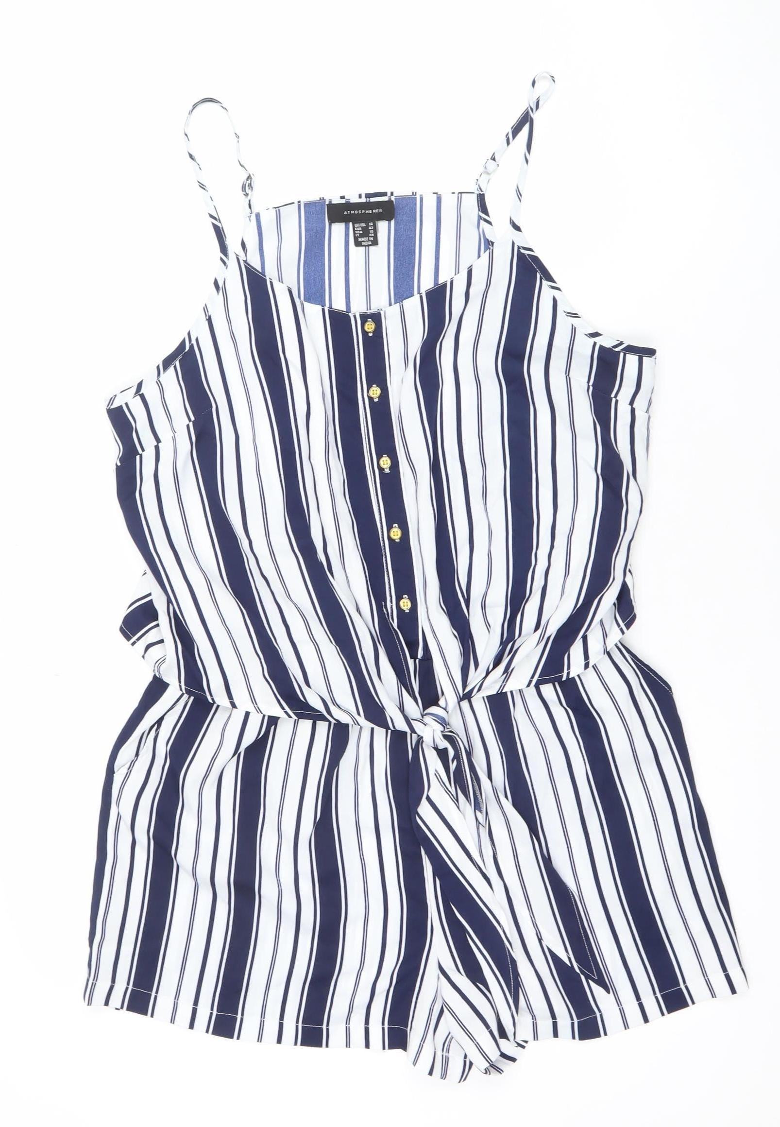 Step into effortless summer style with this chic blue and white striped playsuit by Atmosphere. Designed for a modern woman who enjoys both comfort and fashion, this lightweight, woven one-piece is perfect for sun-soaked days and casual occasions. The soft fabric drapes naturally, ensuring ease of movement and breathable wear all day long. Featuring adjustable shoulder straps, a flattering scoop neckline, and a button-up front detail, this playsuit combines playful design with subtle sophistication. The tie-front accent cinches the waist for a feminine silhouette, while the relaxed shorts lend a comfortable yet stylish edge. Ideal for beach walks, brunch dates, or relaxed garden parties, this sleeveless outfit captures an effortless coastal vibe with its crisp blue and white stripes. Crafted from 100% polyester, the material is easy to care for and maintains its shape, making it a reliable addition to your summer wardrobe. The regular fit enhances comfort without compromising on charm, and the simple striped design ensures it pairs beautifully with sandals, wedges, or trainers. This playsuit is in excellent pre-loved condition, showing minimal signs of wear and maintaining its original quality. Perfect for warm-weather outings or holiday getaways, this playsuit by Atmosphere balances style, practicality, and easy wearability. Whether matched with a denim jacket for cooler evenings or worn alone on sunny days, this timeless piece will keep you looking effortlessly stylish all season long.