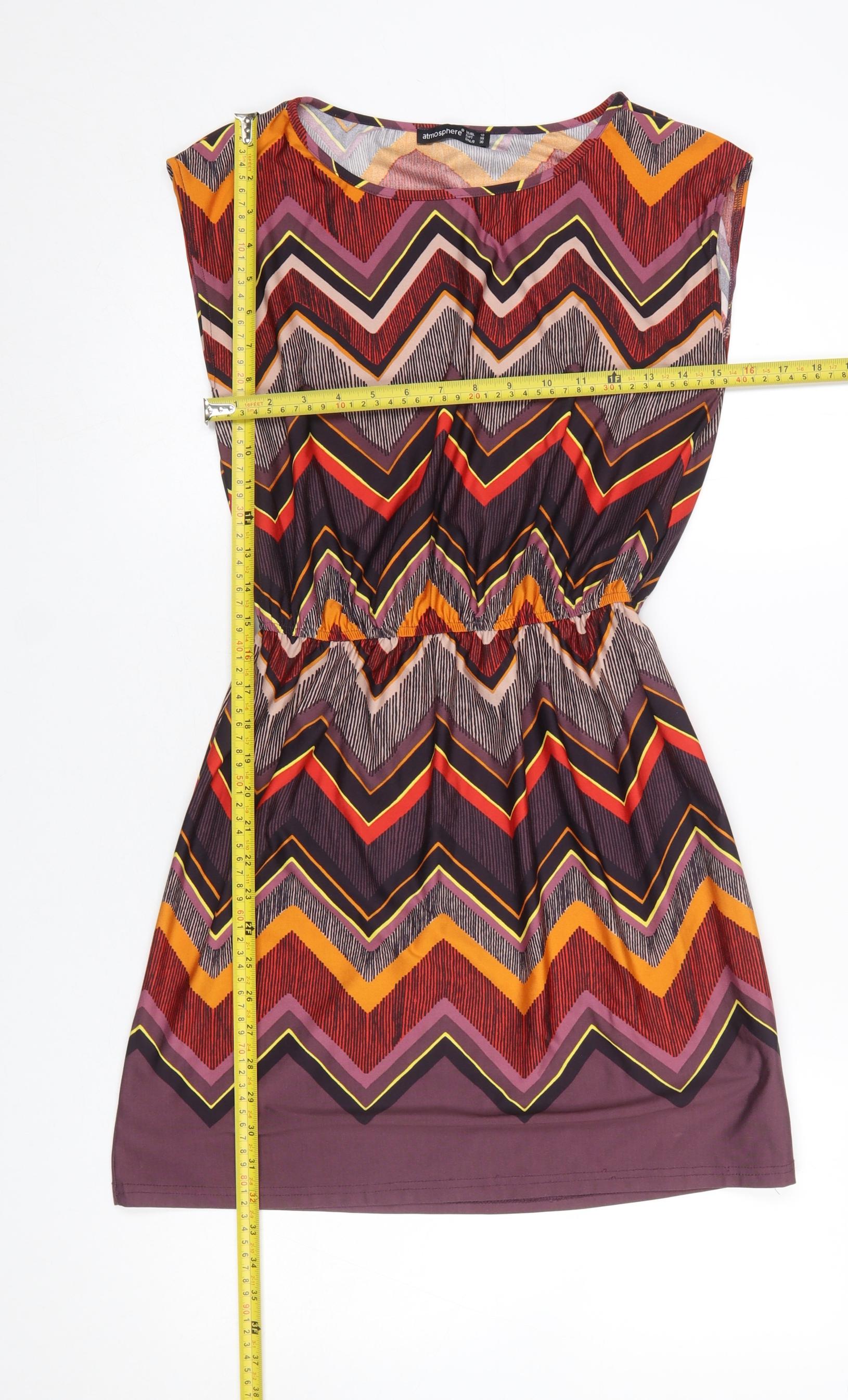 Brighten your wardrobe with this vibrant women’s Chevron Shift Dress from Atmosphere, perfect for adding colour and comfort to your day. Designed in a lively multicoloured zigzag pattern with tones of orange, burgundy, purple and yellow, this dress offers a cheerful yet sophisticated look suitable for casual outings, holidays, or relaxed gatherings. Its flattering knee-length cut and softly elasticated waist create a subtly defined silhouette that flatters the figure while ensuring freedom of movement. Crafted from a 95% polyester and 5% elastane jersey fabric, the dress feels smooth, lightweight and soft against the skin, with just the right amount of stretch for comfort. The sleeveless design and scoop neckline enhance breathability, making it ideal for warmer seasons such as spring and summer. This pull-on dress requires no fastenings or buttons, ensuring easy wearability and practicality. The material’s easy-care nature means it’s machine washable and low-maintenance, perfect for everyday wear or travel. The lively chevron pattern channels a retro aesthetic reminiscent of the 70s, adding a fun touch to a timeless shape, while the shift style keeps it modern and versatile. Pair it with sandals or trainers for a laid-back day look or layer with a cardigan and flats for an easy, polished outfit. Though pre-loved, this item remains in excellent condition with no visible flaws. It has been well cared for, maintaining its colour vibrancy and fabric quality. A stylish, comfortable and affordable wardrobe addition, this Atmosphere dress is bound to become a go-to favourite for effortless chic. Ideal for holidays, weekend wear, or a pop of colour in your casual collection, this chevron dress embodies easy-going elegance with a playful twist.