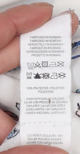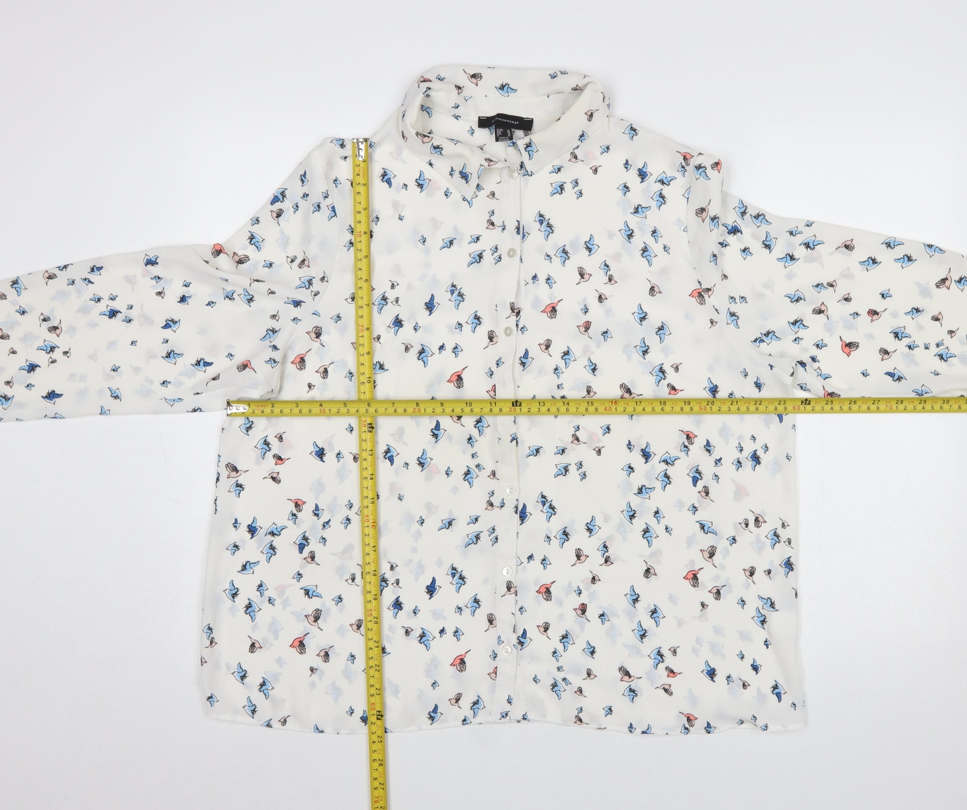 Elevate your everyday wardrobe with this charming Atmosphere women’s blouse, featuring a delicate bird print on a soft white background. Designed in a lightweight chiffon-style fabric, the piece flows beautifully for a stylish yet comfortable fit. The blouse comes in a flattering UK size 20, perfect for women who appreciate both fashion and freedom of movement. Made entirely from 100% polyester, it is breathable and easy to maintain, ideal for warm weather or layering under a blazer. The collared neckline and button-up front give it a classic, elegant appearance, suitable for both casual days and office wear. The long sleeves are finished with neat cuffs to add a polished touch, while the regular fit drapes nicely without clinging. With its whimsical bird motif in soft blue, brown and coral hues, this blouse expresses a subtle love for nature and individuality. Effortlessly versatile, it pairs beautifully with tailored trousers, jeans or skirts, making it a great addition to any wardrobe. Machine washable for easy care, this blouse combines practicality and playful charm in one piece. Although pre-loved, it remains in excellent condition with very light wear and no visible marks or damage. Refresh your look with this graceful nature-inspired top — whether you’re heading to brunch, work or a casual outing, it adds a fresh, lively touch to your outfit. Ideal for spring and summer, this blouse is a breezy choice for those who appreciate femininity and comfort in equal measure. Add it to your collection today and enjoy timeless style with a hint of personality.