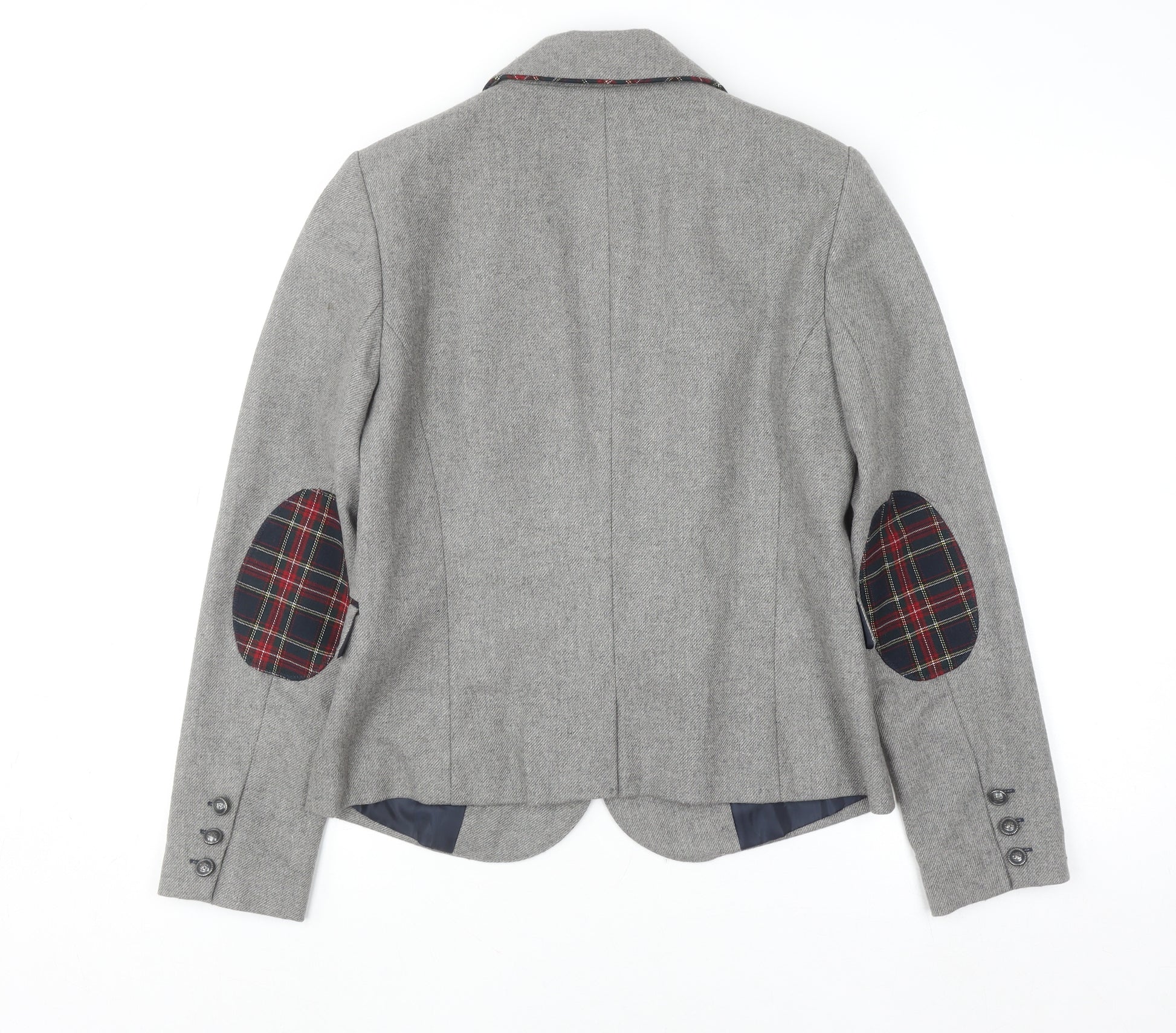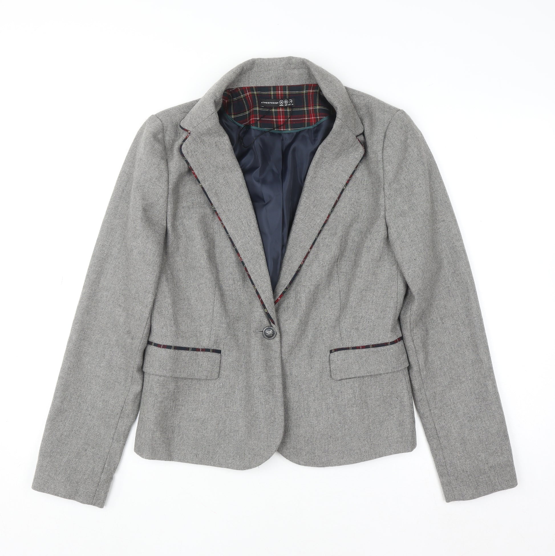 This chic grey tweed blazer from Atmosphere offers timeless sophistication with a modern twist. Designed for the confident and stylish woman, this jacket in UK size 14 delivers a flattering, tailored fit. Made from a quality blend of polyester, acrylic, polyamide, and wool, it offers comfort, structure, and durability—perfect for both professional and casual occasions. The blazer features a sleek single-breasted front, one-button closure, and two front pockets for functional elegance. Its inner tartan contrast lining gives it subtle British charm, while the elbow patches add a touch of traditional character and durability. Fully lined in soft polyester for comfort, it ensures easy wear during transitional seasons like autumn and spring. Ideal for layering over shirts or blouses, this versatile blazer transitions seamlessly from the office to after-hours events. Team it with tailored trousers for a business-ready look or dress it down with jeans for weekend chic. In excellent pre-loved condition, showing only minimal signs of wear, this Atmosphere blazer is a fantastic addition to any wardrobe, embodying quality, versatility, and timeless appeal—all at a great price. A classic piece that offers structure and elegance for every occasion.