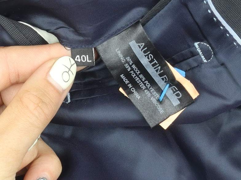 Elevate your formal wardrobe with this elegant men’s blazer from Austin Reed. Tailored in a sophisticated black hue, this single-breasted jacket offers a timeless aesthetic suitable for both business and formal occasions. Crafted from a high-quality fabric blend, the outer material comprises 50% wool and 50% polyester, ensuring durability and a refined finish. The lining, made from 55% polyester and 45% viscose, adds a layer of comfort and versatility, perfect for both Autumn and Spring seasons.Designed with a regular fit, this blazer offers a sleek silhouette without compromising on comfort. The notch lapel style and two-button front add classic touches, while the single-vented back enhances mobility and style. With detailed inner pockets, you'll find practicality meets elegance, offering space for your essentials.Every aspect of this blazer reflects Austin Reed's commitment to superior tailoring. From the four-button sleeve cuffs to the impeccable stitching, attention to detail is evident. Despite slight wear visible, the jacket remains in excellent condition, promising to be a key piece in your wardrobe.Whether for the office, or a formal outing, pair this blazer with your choice of trousers for a complete, polished look. Secure your purchase now and enjoy the confidence of timeless style with Austin Reed's exceptional tailoring.
