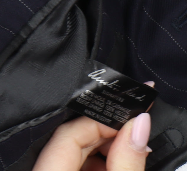 Sophistication meets comfort with this Austin Reed men's blazer. Crafted from a luxurious blend of wool and cashmere, the fabric ensures warmth and style for the cooler months, creating a perfect fit for autumn and winter. The jacket features a classic blue striped pattern which is ideal for formal occasions, business meetings, or elegant dinners. The notched lapels and single-breasted cut add a timeless appeal, while the long length enhances a sleek silhouette. Designed with a two-button front and four-button sleeves, it offers a modern take on a traditional style. The double-vented back enhances mobility, making it as practical as it is stylish. The interior lining composed of viscose ensures a smooth fit over any shirt or sweater. This blazer is a statement of elegance and a worthwhile addition to any refined wardrobe.