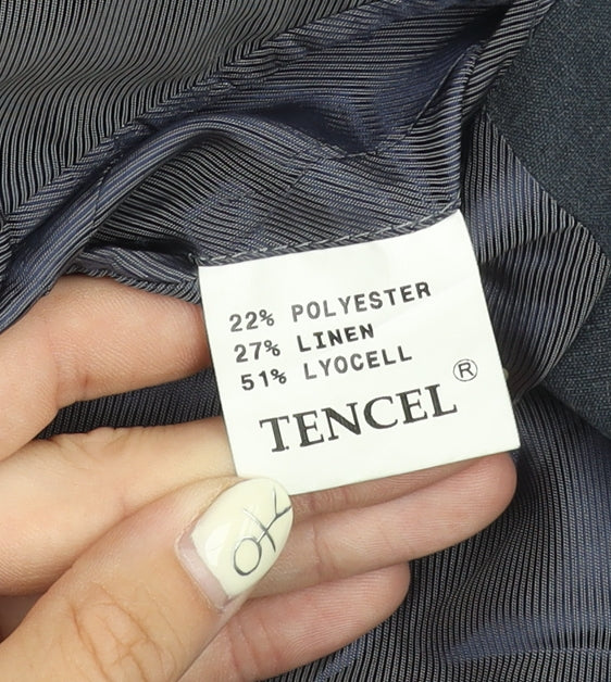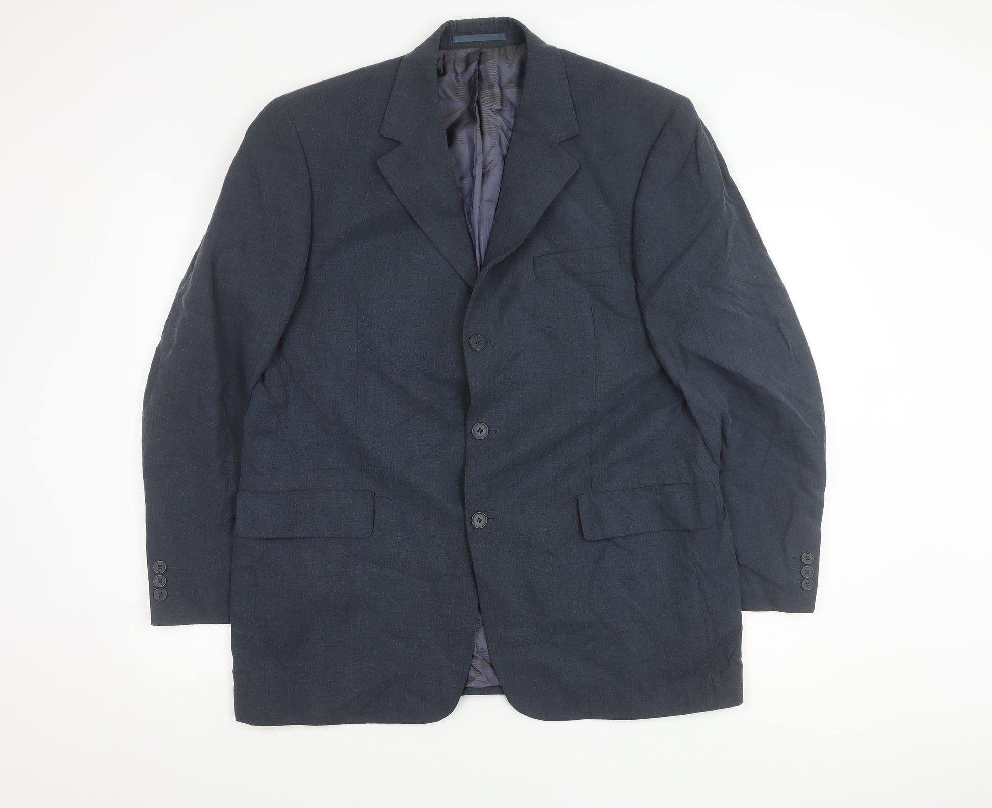 Elevate your formal wardrobe with this classic Austin Reed men's suit jacket. Tailored to perfection in a striking blue hue, this jacket is crafted for the refined gentleman who appreciates timeless style and superior comfort. Made from a luxurious blend of 51% Lyocell, 27% Linen, and 22% Polyester, it offers a soft and breathable fit, ideal for both spring and summer occasions. The regular fit provides a relaxed yet sharp silhouette, perfectly suited for business meetings or formal events.This single-breasted jacket features a notch lapel and a classic three-button front, adding to its sophisticated appeal. The three-button sleeve design and single-vented back ensure a comfortable and sleek fit, while the flat-front style enhances its contemporary look. Its versatile design makes it suitable for both business and formal settings, guaranteeing that you appear polished and professional.Despite being pre-owned, this jacket remains in very good condition, with only light wrinkles indicating slight wear. It's a perfect addition for those seeking quality and style without the premium price tag. Whether you're attending a corporate meeting or a formal gathering, this Austin Reed jacket promises to make a lasting impression. Grab this impeccable piece today and redefine your style effortlessly.