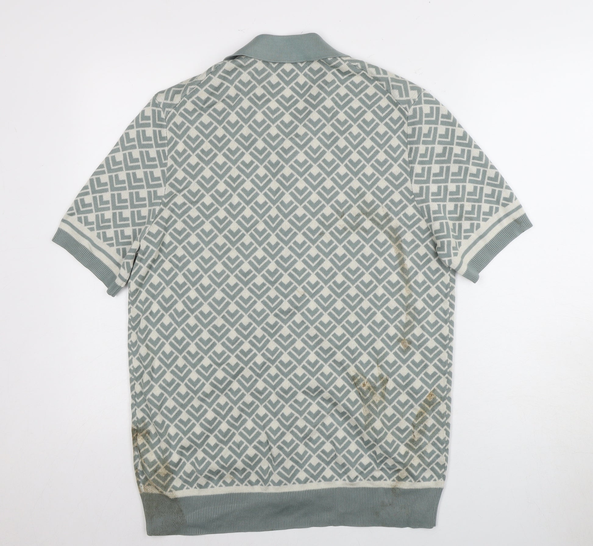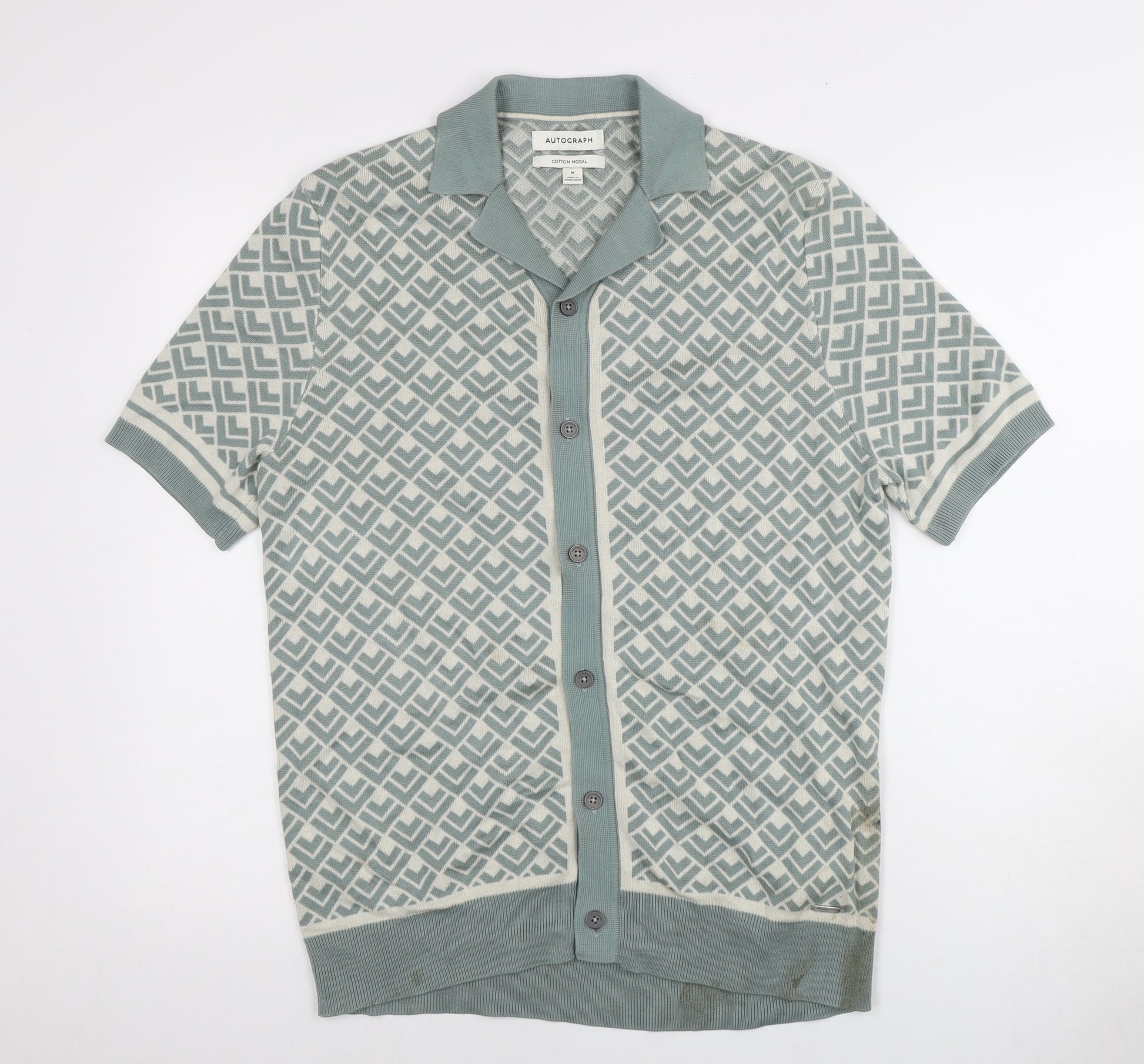 Step into effortless style with this Autograph Men's Cardigan, the epitome of relaxed charm and modern appeal. Crafted from a blend of cotton and modal, this cardigan assures unparalleled comfort while keeping you fashionably on point. The striking geometric pattern in a versatile green hue is perfect for spring and summer, radiating an easygoing vibe that suits both casual outings and laid-back gatherings.The cardigan features a classic collared neckline, adding a touch of polish to the relaxed design. The short sleeves and button accents enhance the overall look, making it a smart choice for any wardrobe. Machine washable fabric ensures easy garment care, aligning with the brand's commitment to quality and convenience.While used, the cardigan remains in good condition with some visible stains, but this minor imperfection is overshadowed by the garment's innate style and durability. Pair it with your favourite jeans or trousers for a look that effortlessly transitions from day to night.Elevate your casual collection with this unique piece from Autograph, designed to bring out the best in modern menswear. Enjoy the perfect blend of comfort and style in every wear.