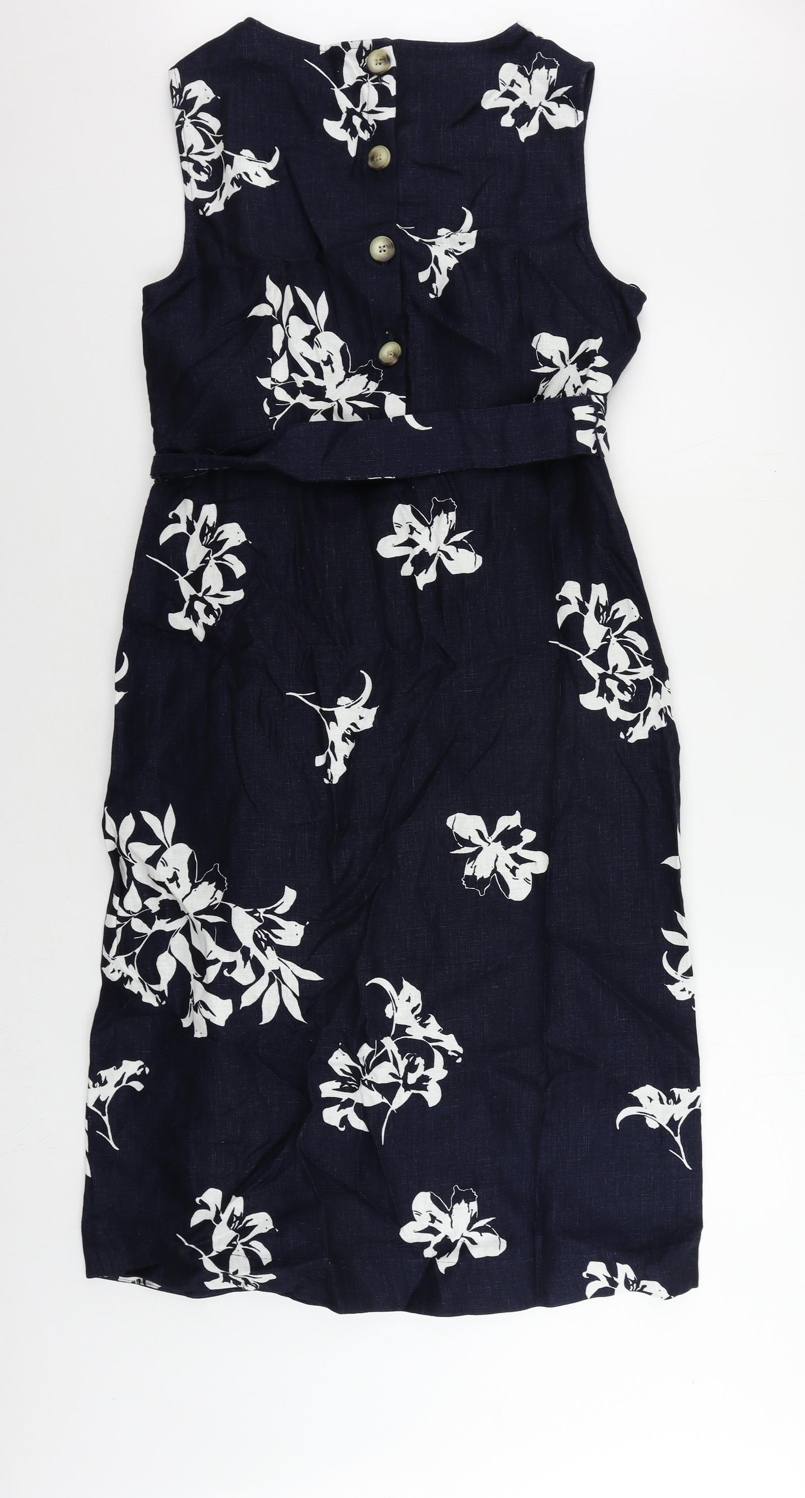 Womens Blue Floral Linen Sheath Size 16 Round Neck Button