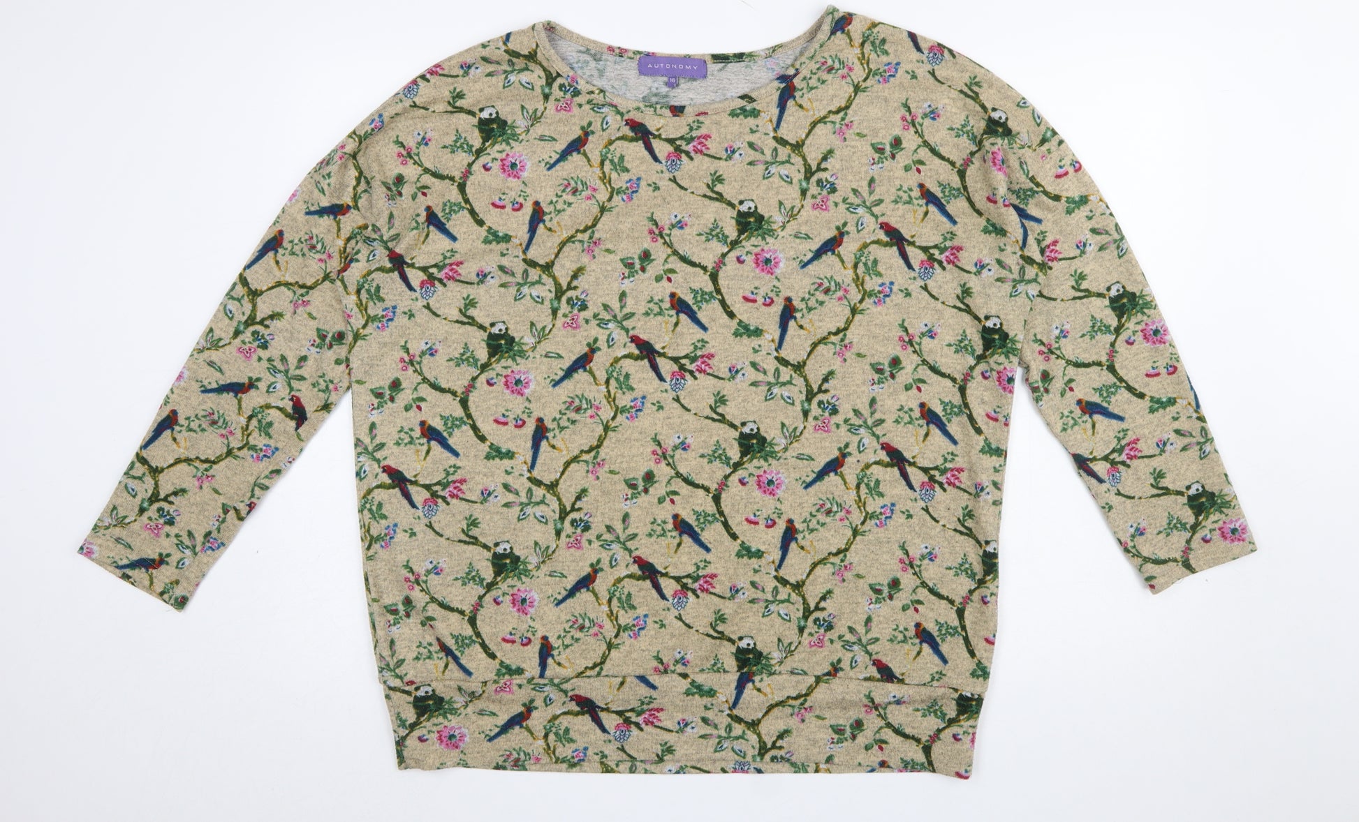Womens Beige Bird Floral Jersey Top Size 16 3/4 Sleeve