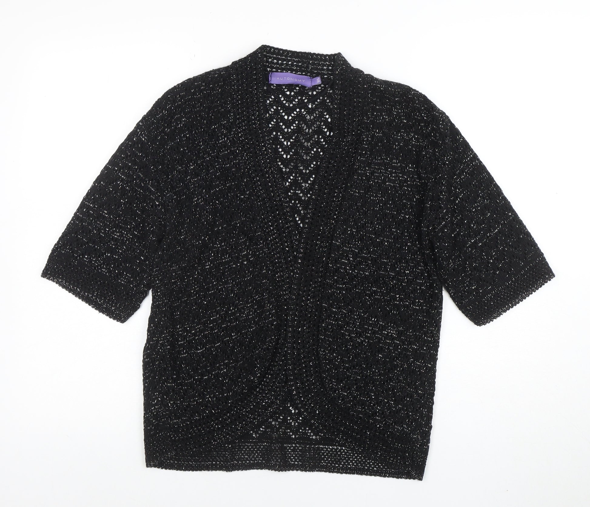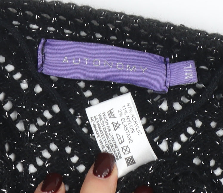 Elevate your layering essentials with this stunning Autonomy women’s black open knit cardigan. Crafted in a relaxed fit for modern casual comfort, this short sleeve cardigan is designed from a soft and lightweight blend of acrylic, nylon, and elastane, offering a smooth balance of durability and stretch. The open-front design makes it perfect for effortless layering over tops and dresses, ideal for transitional weather and year-round versatility. The intricate open-knit texture adds a touch of elegance while keeping the look breathable and chic, ensuring you stay comfortable whether at the office, out shopping, or enjoying a weekend getaway. In timeless black, this cardigan complements any outfit, from professional workwear to casual jeans and trainers. Machine washable for easy care, the fabric stays soft and maintains its shape wash after wash. The short sleeves make it a versatile piece ideal for spring through autumn, while the relaxed silhouette flatters all body types without compromising on comfort. Pair it with trousers and loafers for a polished daytime look or layer over a camisole and slim skirt for a more dressed-up ensemble. This excellent condition piece shows minimal signs of previous wear and remains in beautiful shape, maintaining its original texture and colour depth. Thoughtfully constructed to ensure both style and practicality, the Autonomy black cardigan is a wardrobe favourite for women who appreciate understated luxury and everyday ease. A sensibly priced essential, it combines versatility, quality, and effortless charm in one timeless design — a perfect addition to your knitwear collection, ready to elevate your seasonal wardrobe with sophisticated comfort.