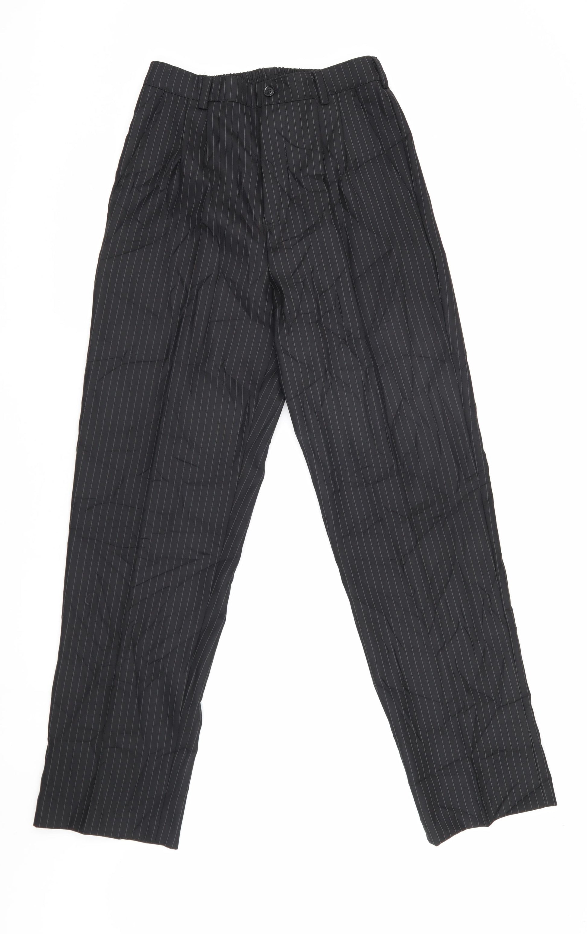 Step into elegance with these AVE Women's Black Pinstripe Trousers, perfect for a sophisticated business look. Designed in a relaxed fit, these trousers feature a timeless striped pattern in a sleek black colour, ensuring they are an essential addition to any wardrobe. The mid-rise design offers comfort and style, while the elastic waist ensures a snug fit, providing ease throughout your day. Crafted for the modern woman, these trousers incorporate a button closure and a flat front, making them suitable for any professional setting. The pleated details add a touch of classic tailoring, enhancing the overall silhouette. Ideal for office wear or formal occasions, pair these trousers with a crisp white shirt or a tailored blazer to complete your polished ensemble. With no visible defects, these trousers are in excellent condition and guarantee durability and style. Priced competitively, they are a must-have for those seeking a blend of comfort and sophistication. Update your collection with this versatile piece, perfect for transitioning from business meetings to evening events effortlessly.