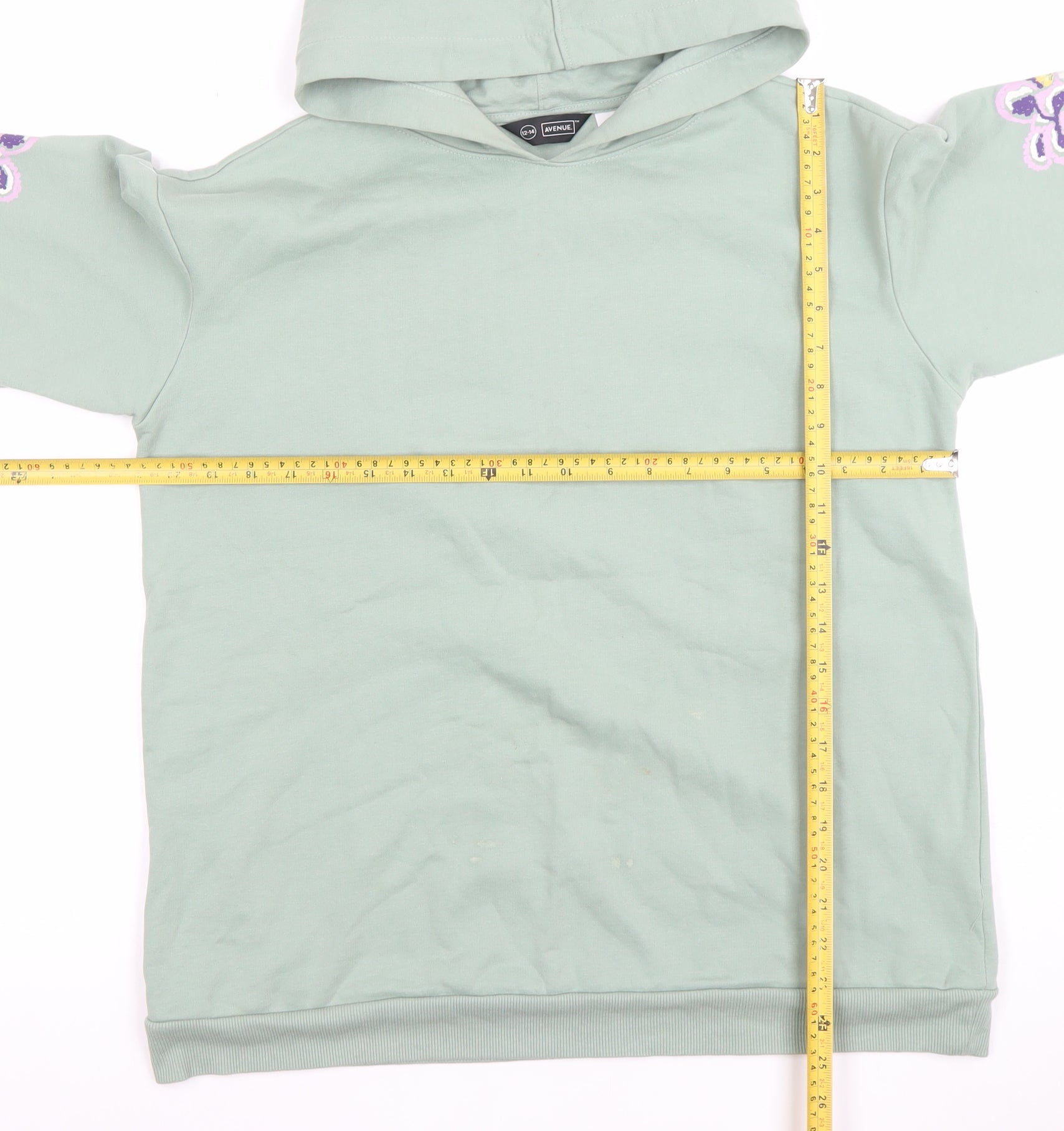 This Avenue women’s green pullover hoodie combines comfort, casual style, and a touch of individuality with its beautifully embroidered floral design along the sleeves. Crafted from a soft 70% cotton and 30% polyester fabric, this hoodie feels cosy and breathable, ideal for layering throughout the seasons. The midweight knit material keeps you comfortable at home or while out and about. The pullover style features a relaxed fit with ribbed cuffs and hem that add extra shape retention and comfort. The hood provides an extra layer of warmth on cooler days, while the floral embroidery adds a distinct feminine and artistic charm, setting this piece apart from plain basics. Designed for everyday wear, this versatile hoodie transitions seamlessly from relaxed casual outfits to more pulled-together weekend looks. The easy-care fabric is machine washable, making it a practical option for daily use. Perfect for walks, lounging, or running errands, it suits the season-spanning wardrobe effortlessly. The muted green tone paired with purple floral detailing provides a soft yet eye-catching aesthetic that complements jeans, leggings, or casual skirts equally well. In very good pre-owned condition, there are some faint light marks on the front, reflected in the price. For anyone who values style, comfort, and an artisan touch, this hoodie is a lovely addition to your collection — understated yet charming and versatile across multiple outfits.