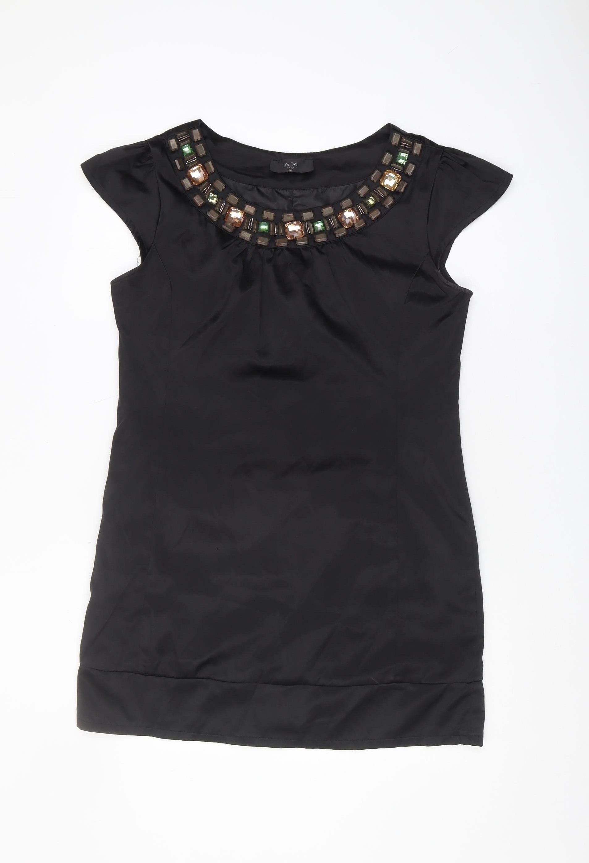Elevate your wardrobe with this chic black beaded blouse from AX Paris, designed to make you stand out on any occasion. Crafted for women with an eye for fashion, this sleeveless blouse features an elegant round neck embellished with eye-catching bead accents, perfect for a party or cocktail event. Made from a comfortable mix of 98% cotton and 2% elastane, it offers a regular fit that flatters your figure while allowing easy movement. In excellent condition with no visible damage, the blouse ensures a luxurious feel against your skin with its solid pattern design and sophisticated style. With a convenient zip closure at the back, this blouse is both fashionable and functional. Hand wash only to maintain its quality and appearance over time. Available in a size 12, this piece sets the stage for a glamorous look whether you're heading to a formal gathering or enjoying a night out. Priced at a mere £22.00, it's an affordable yet premium addition to your collection.