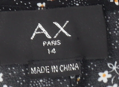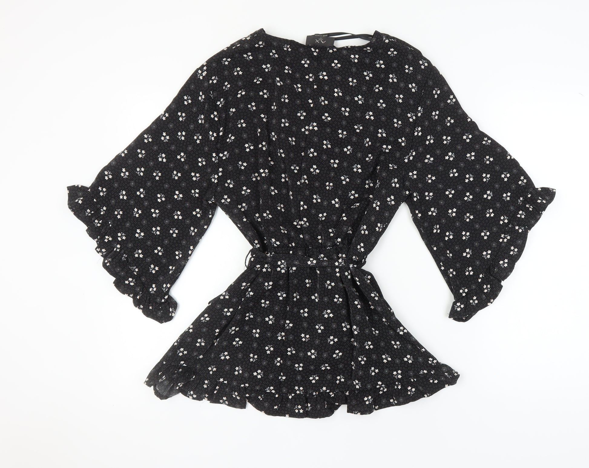 Embrace elegance with this stunning AX Paris women's wrap blouse. In black with a delicate floral pattern, this piece shines with an air of sophistication perfect for your wardrobe. Featuring a flattering V-neckline and flared 3/4 sleeves, the blouse is both stylish and comfortable, making it ideal for a range of occasions. The tie closure adds a touch of feminine flair while ensuring the perfect fit. Crafted from 100% polyester, it is lightweight and ideal for the Spring, Summer and Autumn seasons. Its versatility allows you to wear it casually or to elevate your evening ensemble. The belted accent enhances its chic appeal, promising to turn heads wherever you go. Pair it with jeans for a laid-back yet sophisticated look, or dress it up with a skirt for cocktail evenings. This is a must-have addition for anyone looking to complement their wardrobe with a blend of modern style and timeless elegance. Hand wash only to maintain the quality and give you all the attention it accurately deserves!
