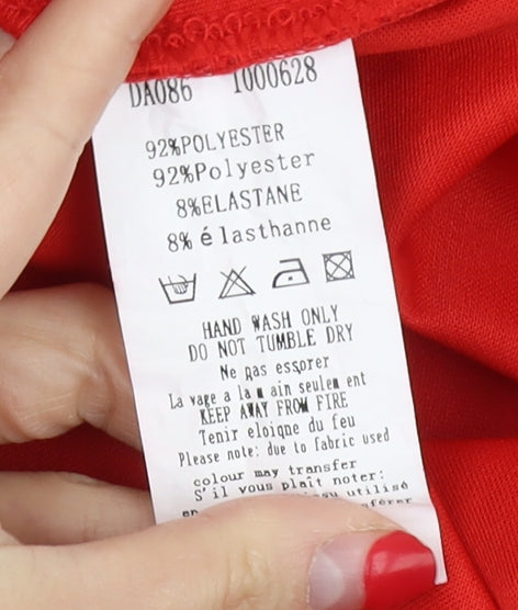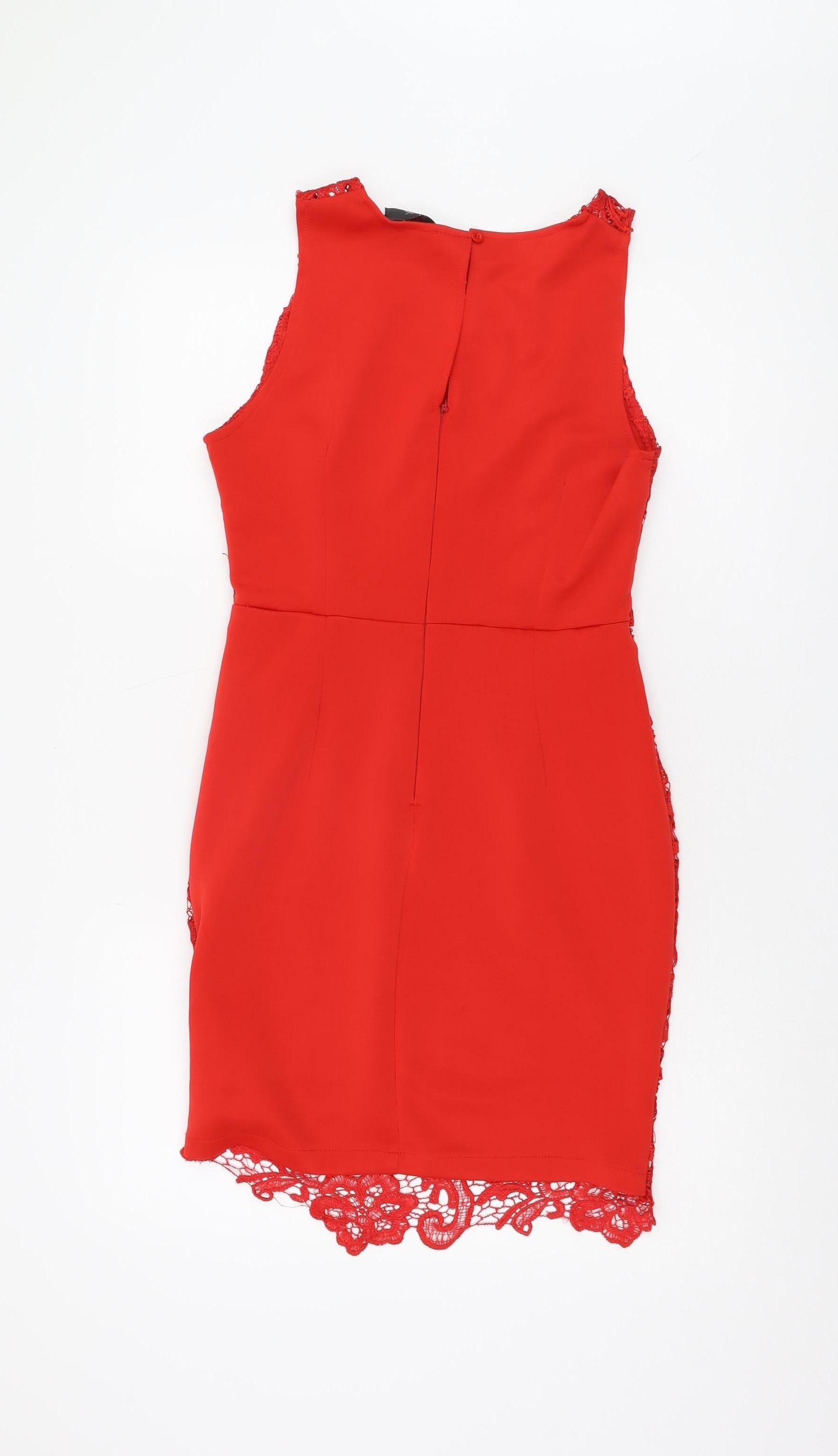 This AX Paris Women's Red Lace Sheath Dress is the perfect statement piece for any party or cocktail occasion. Designed in a striking red colour, it features a flattering sheath style that hugs your curves beautifully. The dress is constructed from a high-quality lace fabric blend of polyester and elastane, ensuring both comfort and durability. This elegant dress is fully lined, providing a smooth fit over the body. Featuring a classic round neckline and a hidden zip closure, this sleeveless dress accentuates your shoulders. The short length makes it a suitable choice for both spring and summer weddings or elegant evening parties. Although pre-loved, the dress remains in excellent condition with no visible signs of wear, promising you a chic look for your next event at an affordable price.
